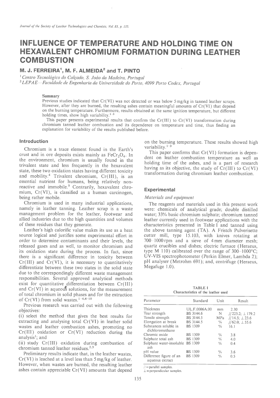 Previous studies indicated that Cr( VI) was not detected or was below 5 mg/kg in tanned leather scraps. However, after they are burned, the resulting ashes contain meaningfu] amounts of Cr(VI) that depend on the burning temperature. Furthermore, results obtained at the same ignition temperature, but different holding times, show high variability. 3 This paper presents experimental results that confirm the Cr(II1) to Cr(VI) transformation during chromium tanned leather combustion and its dependence on temperature and time, thus finding an explanation for variability of the results published before.