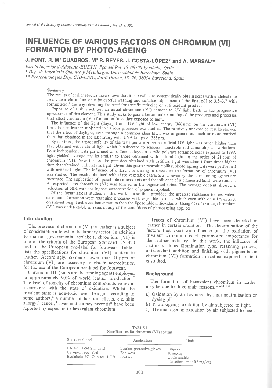 By contrast, the reproducibility of the tests performed with artificial UV light was much higher than that obtained with natural light which is subjected to seasonal, timetable and climatological variations. Four independent tests performed on different days on acrylic polymer retanned skins exposed to UVA light yielded average results similar to those obtained with natural light, in the order of 21 ppm of chromium (VI). Nevertheless, the precision obtained with artificial light was almost four times higher than that obtained with natural light. Given this greater reproducibility. photo-ageing tests were performed with artificial light. The influence of different retanning processes on the formation of chromium (VI) was studied. The results obtained with three vegetable extracts and seven synthetic retanning agents are presented. The application of liposoluble antioxidants and the influence of a pigmented finish were studied. As expected, less chromium (VI) was formed in the pigmented skins. The average content showed a reduction of 500/ with the highest concentration of pigment applied.