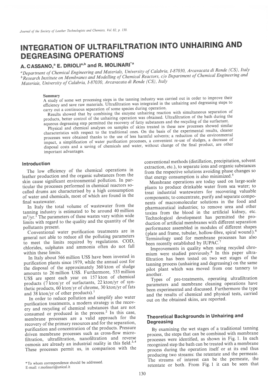 A study of some wet processing steps in the tanning industry was carried out in order to improve their efficiency and save raw materials. Ultrafiltration was integrated in the unhairing and degreasing steps to carry out a continuous separation of some species during operation.