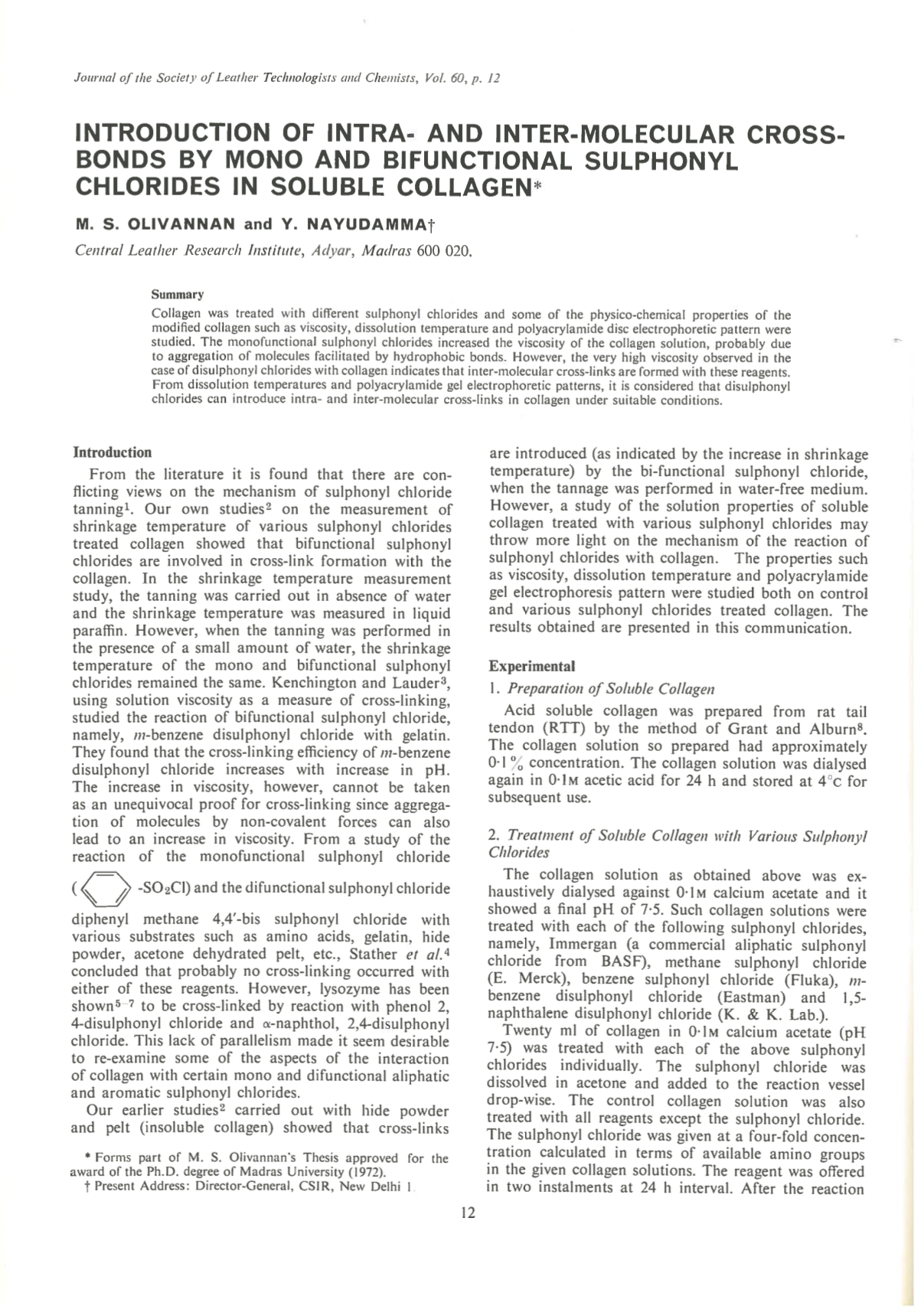 Collagen was treated with different sulphonyl chlorides and some of the physico-chemical properties of the modified collagen such as viscosity, dissolution temperature and polyacrylamide disc electrophoretic pattern were studied. The monofunctional sulphonyl chlorides increased the viscosity of the collagen solution, probably due to aggregation of molecules facilitated by hydrophobic bonds. However, the very high viscosity observed in the case of disulphonyl chlorides with collagen indicates that inter-molecular cross-links are formed with these reagents. From dissolution temperatures and polyacrylamide gel electrophoretic patterns, it is considered that disulphonyl chlorides can introduce intra- and inter-molecular cross-links in collagen under suitable conditions.