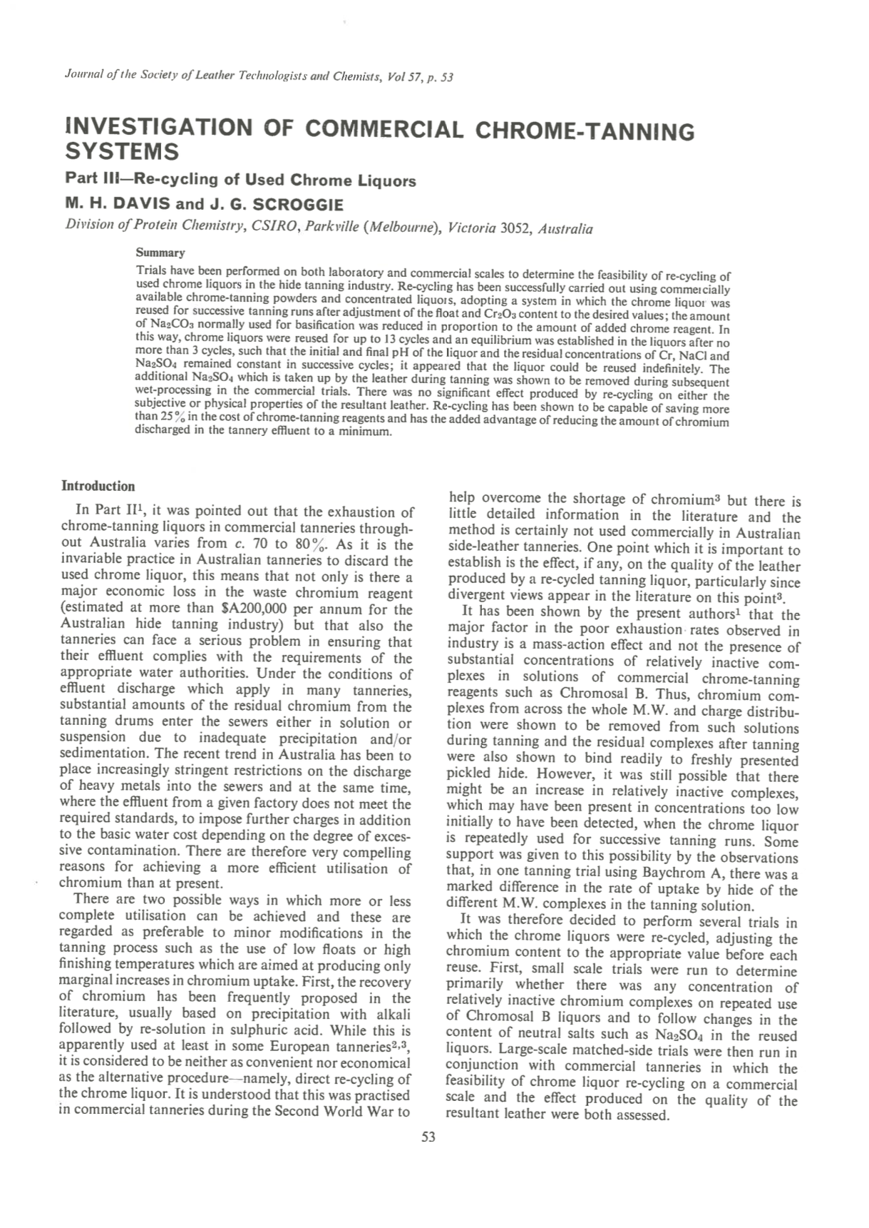 Trials have been performed on both laboratory and commercial scales to determine the feasibility of re-cycling of used chrome liquors in the hide tanning industry. Re-cycling has been successfully carried out using commercially available chrome-tanning powders and concentrated liquors, adopting a system in which the chrome liquor was reused for successive tanning runs after adjustment of the float and Cr₂O₃ content to the desired values; the amount of Na₂CO₃ normally used for basification was reduced in proportion to the amount of added chrome reagent. In this way, chrome liquors were reused for up to 13 cycles and an equilibrium was established in the liquors after no more than 3 cycles, such that the initial and final pH of the liquor and the residual concentrations of Cr, NaCl, and Na₂SO₄ remained constant in successive cycles; it appeared that the liquor could be reused indefinitely. The additional Na₂SO₄, which is taken up by the leather during tanning was shown to be removed during subsequent wet-processing in the commercial trials. There was no significant effect produced by re-cycling on either the subjective or physical properties of the resultant leather. Re-cycling has been shown to be capable of saving more than 25% in the cost of chrome-tanning reagents and has the added advantage of reducing the amount of chromium discharged in the tannery effluent to a minimum.