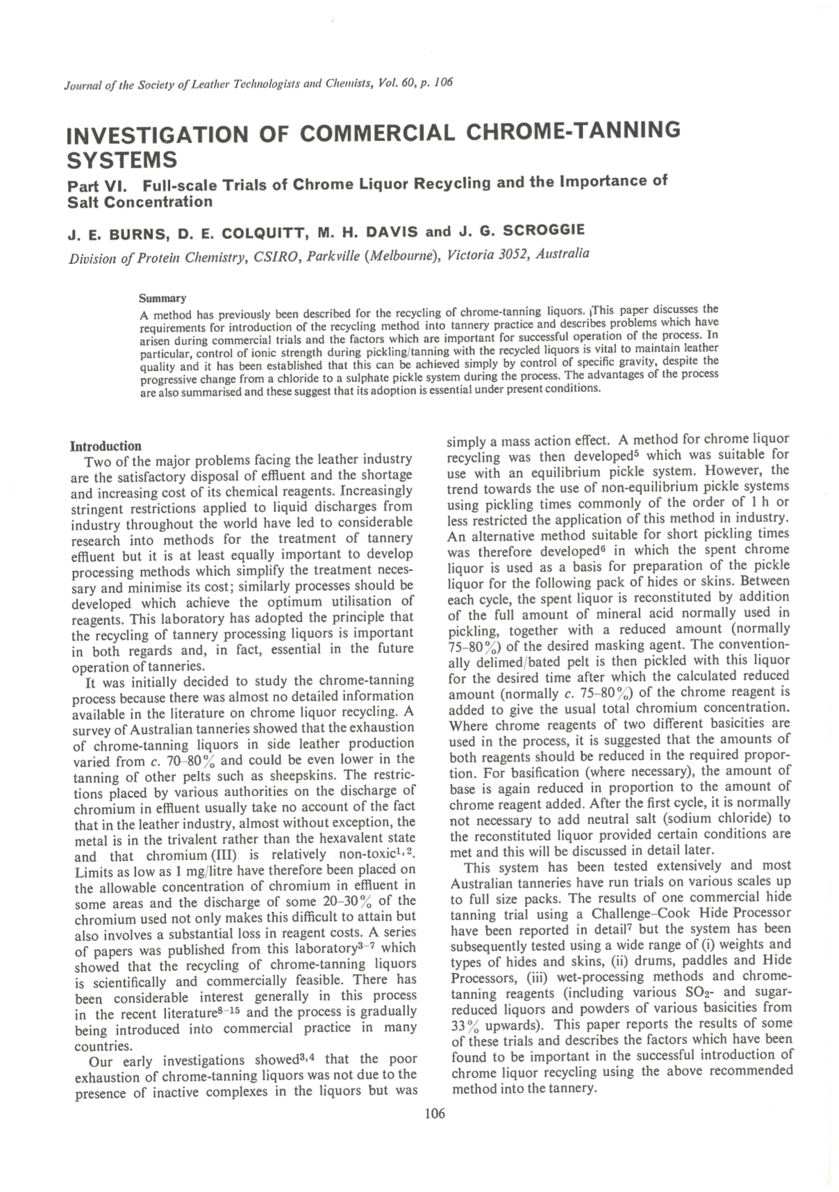 A method has previously been described for the recycling of chrome-tanning liquors. This paper discusses the requirements for introduction of the recycling method into tannery practice and describes problems which have arisen during commercial trials and the factors which are important for successful operation of the process. In particular, control of ionic strength during pickling/tanning with the recycled liquors is vital to maintain leather quality and it has been established that this can be achieved simply by control of specific gravity, despite the progressive change from a chloride to a sulphate pickle system during the process. The advantages of the process are also summarised and these suggest that its adoption is essential under present conditions.