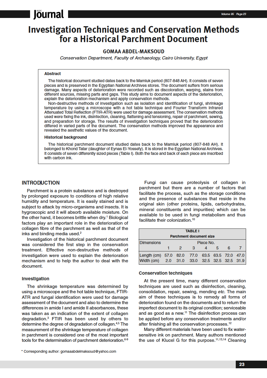 Non-destructive methods of investigation such as isolation and identification of fungi, shrinkage temperature by using a microscope with a hot table technique and Fourier Transform Infrared Attenuated Total Reflection (FTIR-ATR) were used for damage assessment. The conservation methods used were fixing the ink, disinfection, cleaning, flattening and tensioning, repair of parchment, sewing, and preparation for storage. The results of investigation techniques proved that the deterioration differed in varied parts of the document. The conservation methods improved the appearance and revealed the aesthetic values of the document.