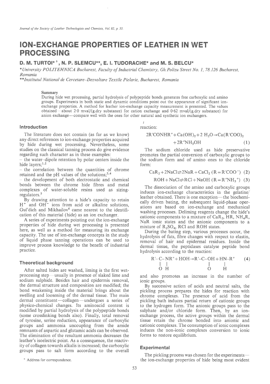 During hide wet processing, partial hydrolysis of polypeptide bonds generates free carboxylic and amino groups. Experiments in both static and dynamic conditions point out the appearance of significant ionexchange properties. A method for leather ion-exchange capacity measurement is presented. The values obtained—about 20 mval/(g.dry substance) for cation exchange and 062 mval/(g.dry substance) for anion exchange—compare well with the ones for other natural and synthetic ion exchangers.