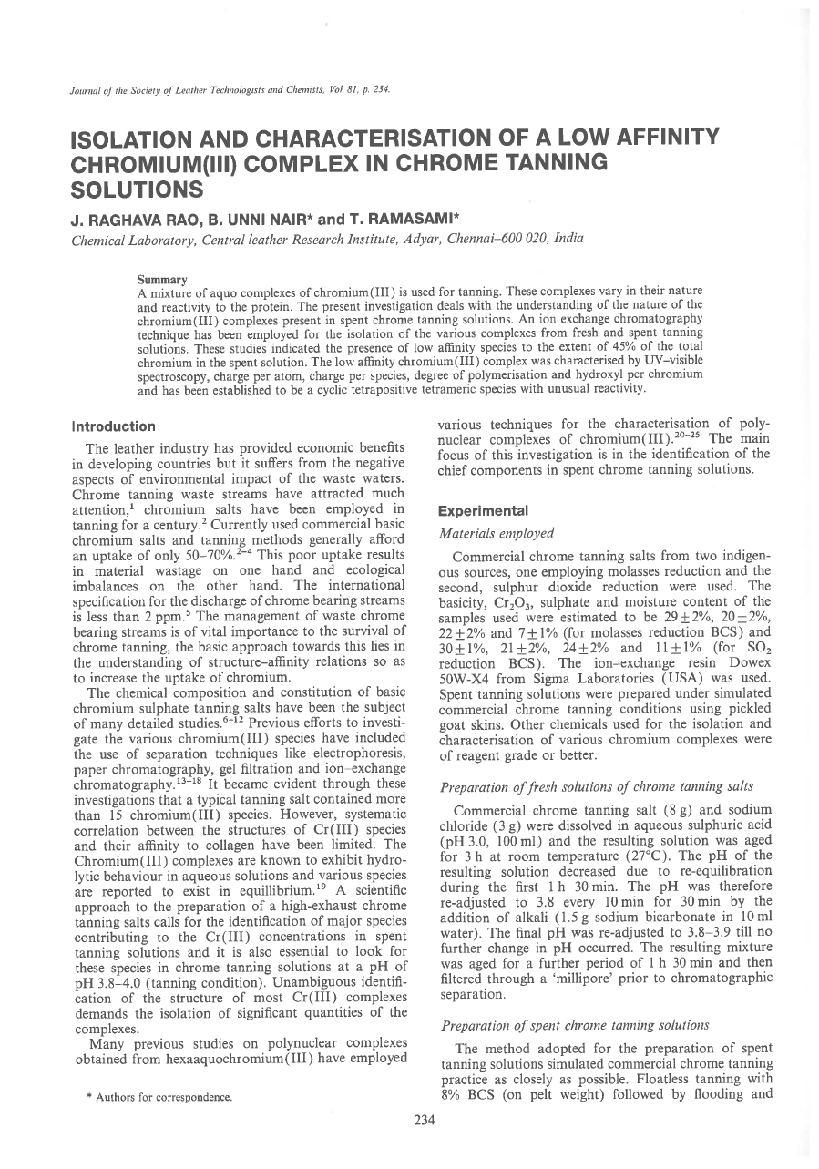 A mixture of aquo complexes of chromium(III) is used for tanning. These complexes vary in their nature and reactivity to the protein. The present investigation deals with the understanding of the nature of the chromium(III) complexes present in spent chrome tanning solutions. An ion exchange chromatography technique has been employed for the isolation of the various complexes from fresh and spent tanning solutions. These studies indicated the presence of low affinity species to the extent of 45% of the total chromium in the spent solution. The low affinity chromium (III) complex was characterised by UV—visible spectroscopy, charge per atom, charge per species, degree of polymerisation and hydroxyl per chromium and has been established to be a cyclic tetrapositive tetrameric species with unusual reactivity.