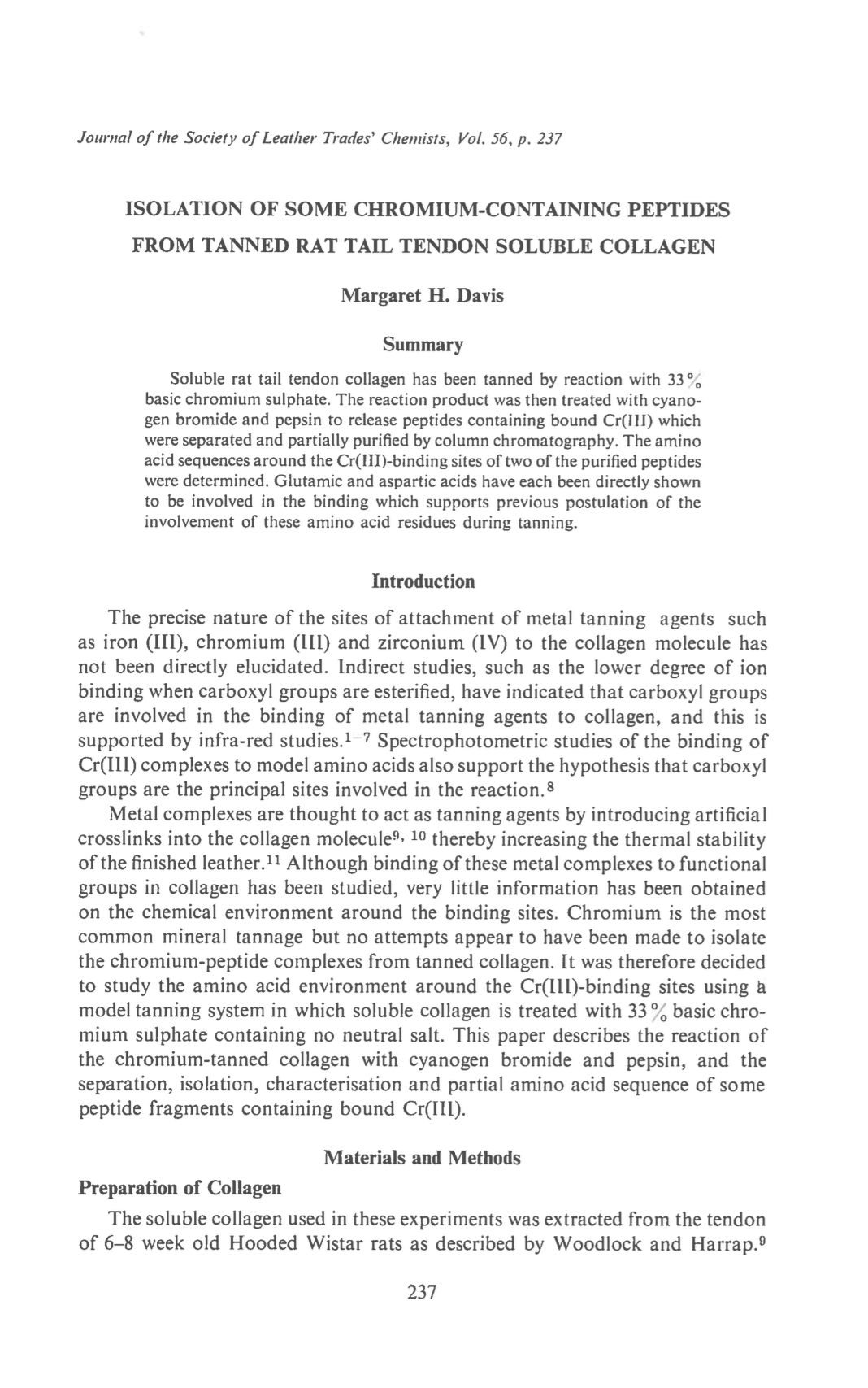 Soluble rat tail tendon collagen has been tanned by reaction with 33% basic chromium sulphate. The reaction product was then treated with cyanogen bromide and pepsin to release peptides containing bound Cr(III), which were separated and partially purified by column chromatography. The amino acid sequences around the Cr(III)-binding sites of two of the purified peptides were determined. Glutamic and aspartic acids have each been directly shown to be involved in the binding which supports previous postulation of the involvement of these amino acid residues during tanning.