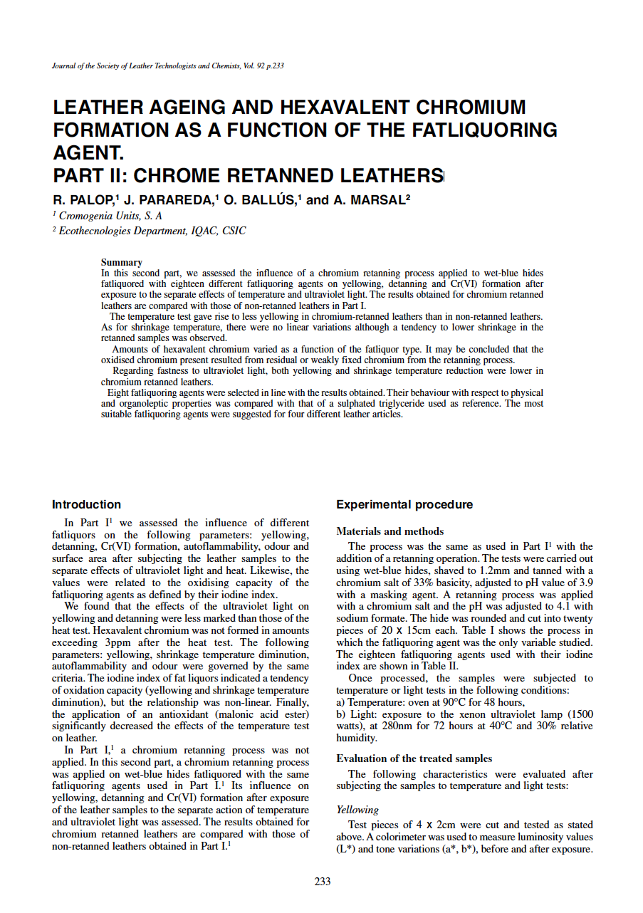 In this second part, we assessed the influence of a chromium retanning process applied to wet-blue hides fatliquored with eighteen different fatliquoring agents on yellowing, detanning and Cr(VI) formation after exposure to the separate effects of temperature and ultraviolet light. The results obtained for chromium retanned leathers are compared with those of non-retanned leathers in Part I.