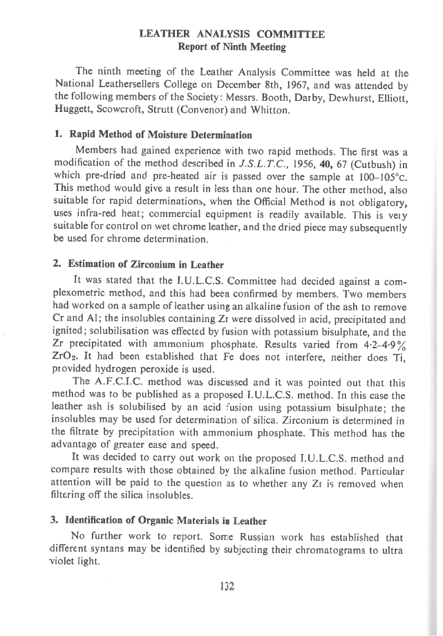 The ninth meeting of the Leather Analysis Committee was held at the National Leathersellers College on December 8th, 1967, and was attended by the following members of the Society: Messrs. Booth, Darby, Dewhurst, Elliott, Huggett, Scowcroft, Strutt (Convenor) and Whitton.