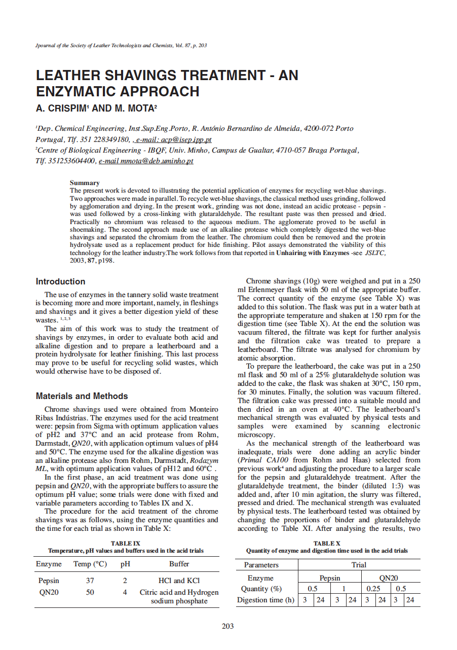 The present work is devoted to illustrating the potential application of enzymes for recycling wet-blue shavings. Two approaches were made in parallel. To recycle wet-blue shavings, the classical method uses grinding, followed by agglomeration and drying. In the present work, grinding was not done, instead an acidic protease – pepsin – was used followed by a cross-linking with glutaraldehyde. The resultant paste was then pressed and dried. Practically no chromium was released to the aqueous medium. The agglomerate proved to be useful in shoemaking. The second approach made use of an alkaline protease which completely digested the wet-blue shavings and separated the chromium from the leather. The chromium could then be removed and the protein hydrolysate used as a replacement product for hide finishing. Pilot assays demonstrated the viability of this technology for the leather industry.The work follows from that reported in Unhairing with Enzymes -see JSLTC, 2003, 87, p198.
