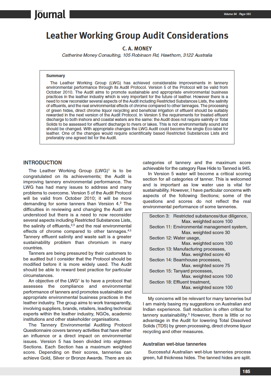 The Leather Working Group (LWG) has achieved considerable improvements in tannery environmental performance through its Audit Protocol. Version 5 of the Protocol will be valid from October 2010. The Audit aims to promote sustainable and appropriate environmental business practices in the leather industry which is very important for the future of leather. However there is a need to now reconsider several aspects of the Audit including Restricted Substances Lists, the salinity of effluents, and the real environmental effects of chrome compared to other tannages. The processing of green hides, direct chrome liquor recycling and beneficial irrigation of effluent should be suitably rewarded in the next version of the Audit Protocol. In Version 5 the requirements for treated effluent discharge to both inshore and coastal waters are the same: the Audit does not require salinity or Total Solids to be assessed for effluent discharge to rivers or lakes. This is not environmentally sound and should be changed. With appropriate changes the LWGA udit could become the single Eco-label for leather. One of the changes would require scientifically based Restricted Substances Lists and preferably one agreed list for the Audit.