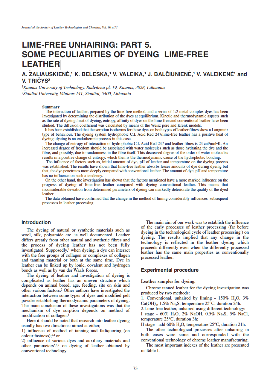 On the other hand, the investigation has shown that the factors mentioned have a more marked influence on the progress of dyeing of lime-free leather compared with dyeing conventional leather. This means that inconsiderable deviation from determined parameters of dyeing can markedly deteriorate the quality of the dyed leather.