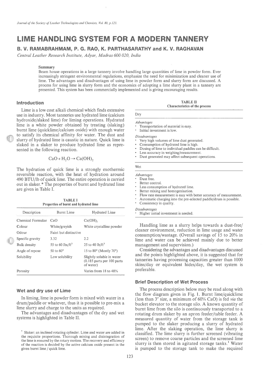 Beam house operations in a large tannery involve handling large quantities of lime in powder form. Ever increasingly stringent environmental regulations, emphasize the need for minimization and cleaner use of lime. The advantages and disadvantages of using lime in powder form and slurry form are discussed. A process for using lime in slurry form and the economics of adopting a lime slurry plant in a tannery are presented. This system has been commercially implemented and is giving encouraging results.