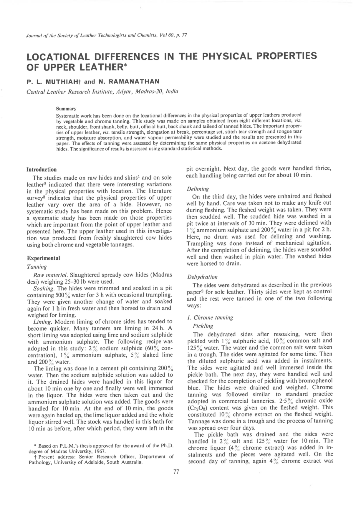 Systematic work has been done on the locational differences in the physical properties of upper leathers produced by vegetable and chrome tanning. This study was made on samples obtained from eight different locations, viz., neck, shoulder, front shank, belly, butt, official butt, back shank and tailend of tanned hides. The important properties of upper leather, viz., tensile strength, elongation at break, percentage set, stitch tear strength and tongue tear strength, moisture absorption, and water vapour permeability were studied and the results are presented in this paper. The effects of tanning were assessed by determining the same physical properties on acetone dehydrated hides. The significance of results is assessed using standard statistical methods.