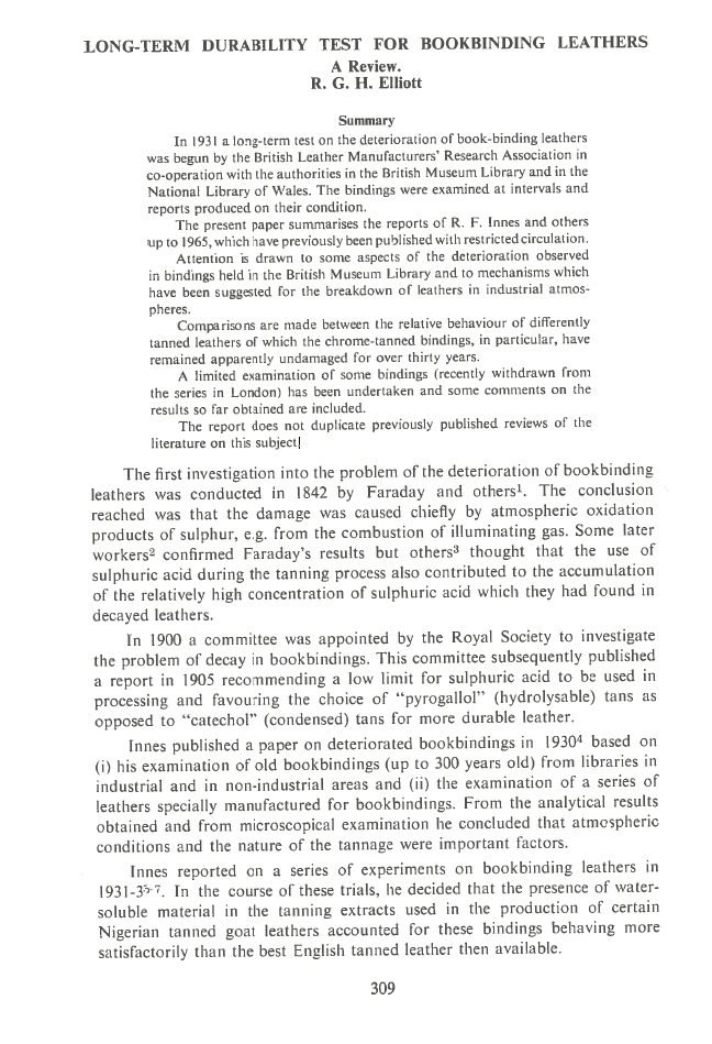 n 1931, a long-term test on the deterioration of book-binding leathers was started by the British Leather Manufacturers’ Research Association, in cooperation with the British Museum Library and the National Library of Wales. The bindings were examined at intervals and reports were produced on their condition. This paper summarizes the reports of R. F. Innes and others up to 1965, which were previously published with limited circulation. Attention is given to some aspects of deterioration observed in bindings kept in the British Museum Library and to suggested mechanisms for the breakdown of leathers in industrial atmospheres. Comparisons are made between the behaviour of different types of tanned leathers, especially noting that chrome-tanned bindings have remained apparently undamaged for over thirty years. A limited examination of some bindings recently withdrawn from the series in London has been carried out, and some comments on the results are included. The report does not duplicate previously published literature reviews on this topic.