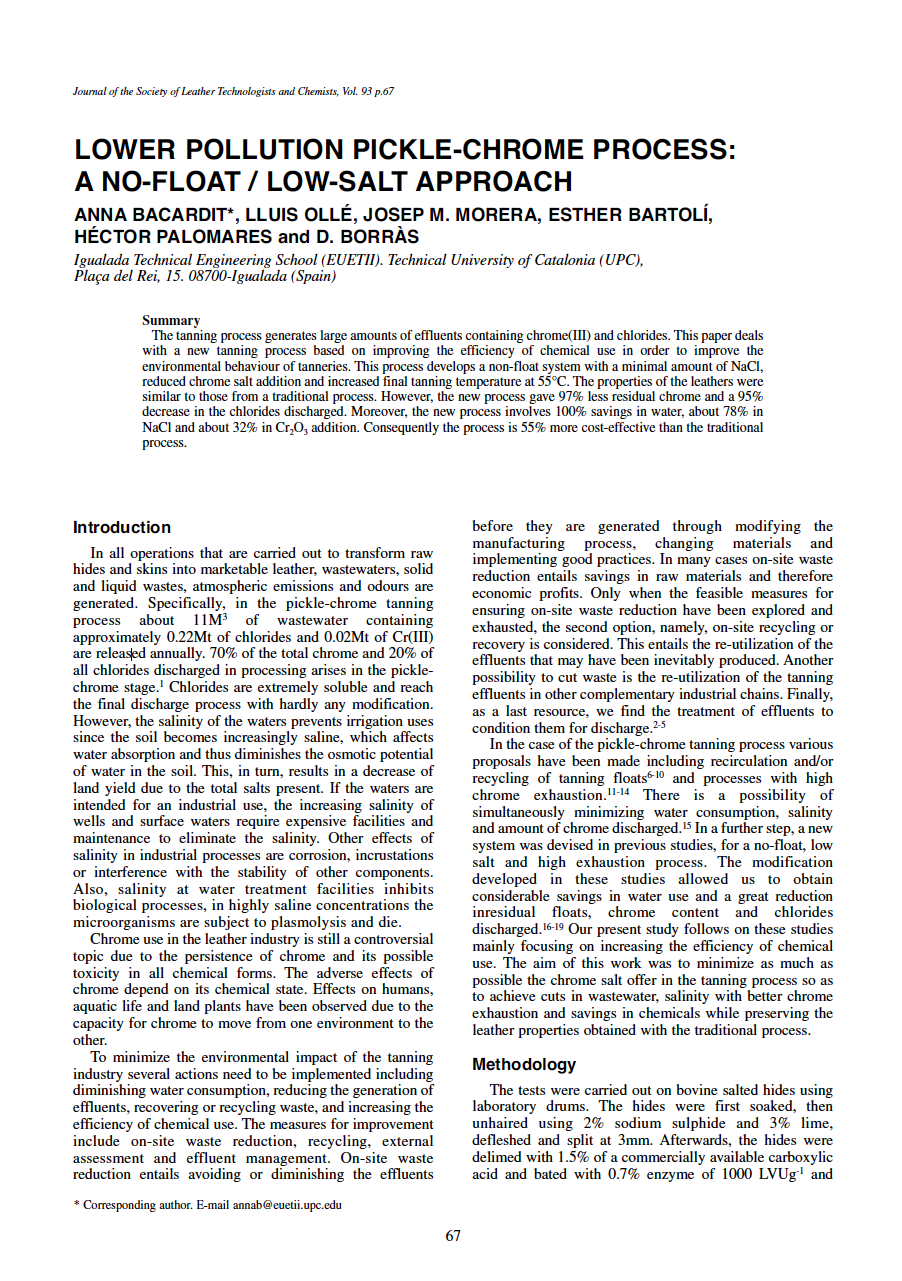 The tanning process generates large amounts of effluents containing chrome(III) and chlorides. This paper deals with a new tanning process based on improving the efficiency of chemical use in order to improve the environmental behaviour of tanneries. This process develops a non-float system with a minimal amount of NaCl, reduced chrome salt addition and increased final tanning temperature at 55°C. The properties of the leathers were similar to those from a traditional process. However, the new process gave 97% less residual chrome and a 95% decrease in the chlorides discharged. Moreover, the new process involves 100% savings in water, about 78% in NaCl and about 32% in Cr2O3 addition. Consequently the process is 55% more cost-effective than the traditional process.