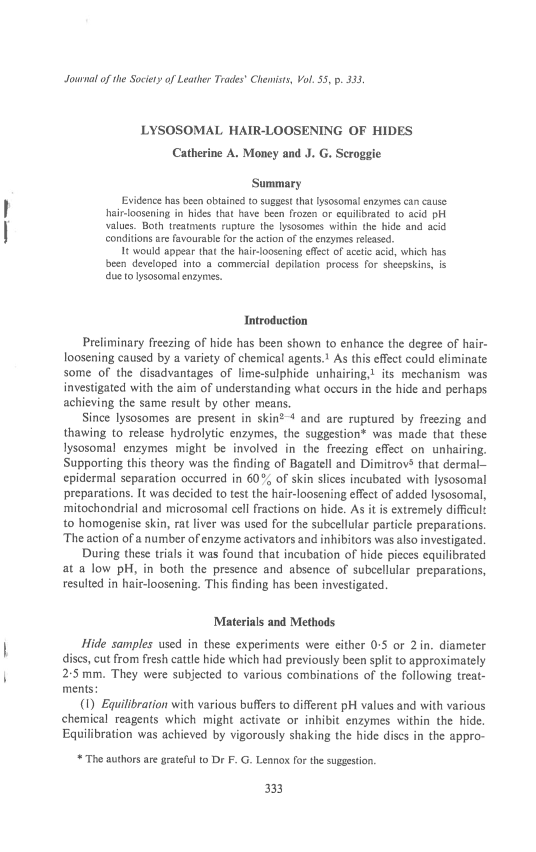 Evidence has been obtained to suggest that lysosomal enzymes can cause hair-loosening in hides that have been frozen or equilibrated to acid pH values. Both treatments rupture the lysosomes within the hide and acid conditions are favourable for the action of the enzymes released. It would appear that the hair-loosening effect of acetic acid, which has been developed into a commercial depilation process for sheepskins, is due to lysosomal enzymes.