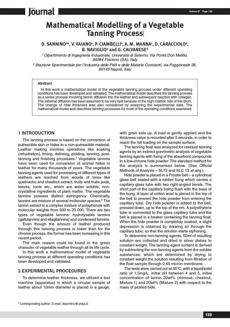 In this work a mathematical model of the vegetable tanning process under different operating conditions has been developed and validated. The mathematical model describes the tanning process as a series process involving tannin diffusion into the leather and subsequent reaction with collagen. The external diffusion has been assumed to be very fast because of the high rotation rate of the drum. The change of hide thickness was also considered by analyzing the experimental data. The mathematical model well describes tanning processes for most of the operating conditions examined.