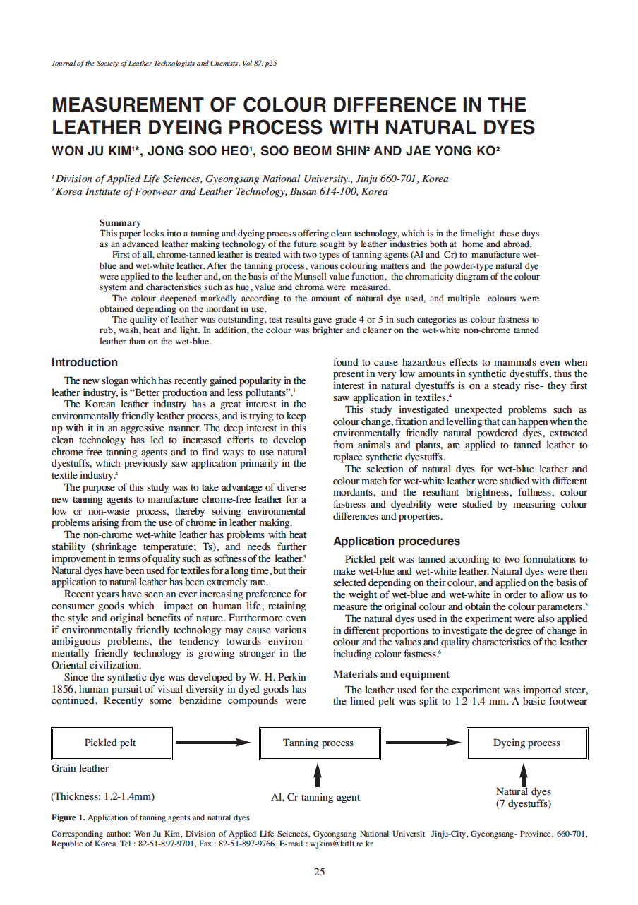 First of all, chrome-tanned leather is treated with two types of tanning agents (Al and Cr) to manufacture wetblue and wet-white leather. After the tanning process, various colouring matters and the powder-type natural dye were applied to the leather and, on the basis of the Munsell value function, the chromaticity diagram of the colour system and characteristics such as hue, value and chroma were measured.