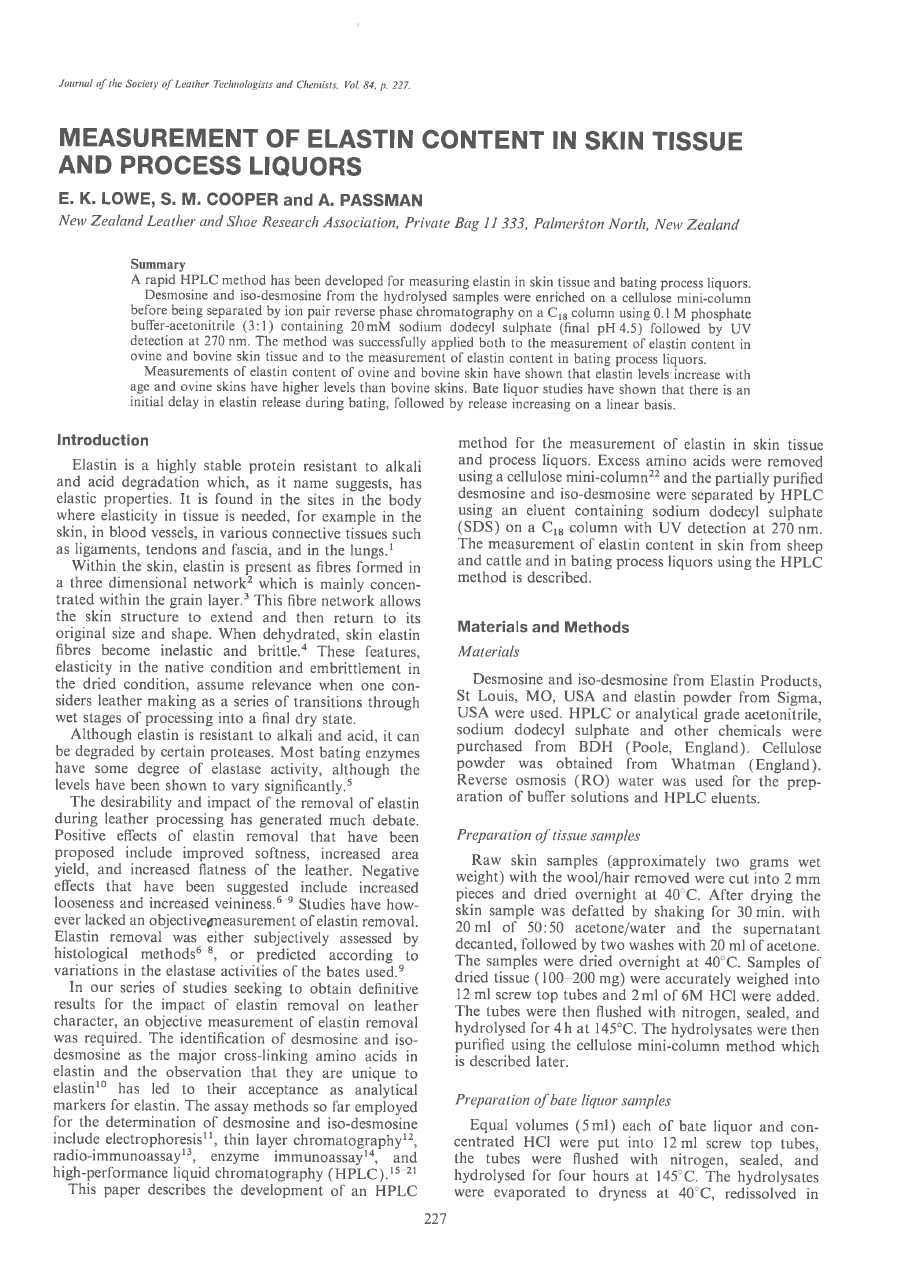 Desmosine and iso-desmosine from the hydrolysed samples were enriched on a cellulose mini-column before being separated by ion pair reverse phase chromatography on a C, column using 0.1 M phosphate buffer-acetonitrile (3: 1) containing 20mM sodium dodecyl sulphate (final pH 4.5) followed by UV detection at 270 nm. The method was successfully applied both to the measurement of elastin content in ovine and bovine skin tissue and to the measurement of elastin content in bating process liquors.