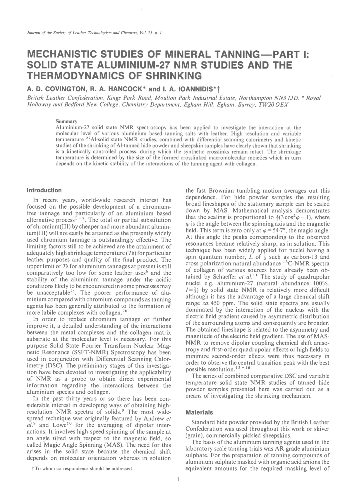 Aluminium-27 solid state NMR spectroscopy has been applied to investigate the interaction at the molecular level of various aluminium based tanning salts with leather. High resolution and variable temperature 27Al-solid state NMR studies, combined with differential scanning calorimetry and kinetic studies of the shrinking of Al-tanned hide powder and sheepskin samples have clearly shown that shrinking is a kinetically controlled process, during which the synthetic crosslinks remain intact. The shrinkage temperature is determined by the size of the formed crosslinked macromolecular moieties which in turn depends on the kinetic stability of the interactions of the tanning agent with collagen.