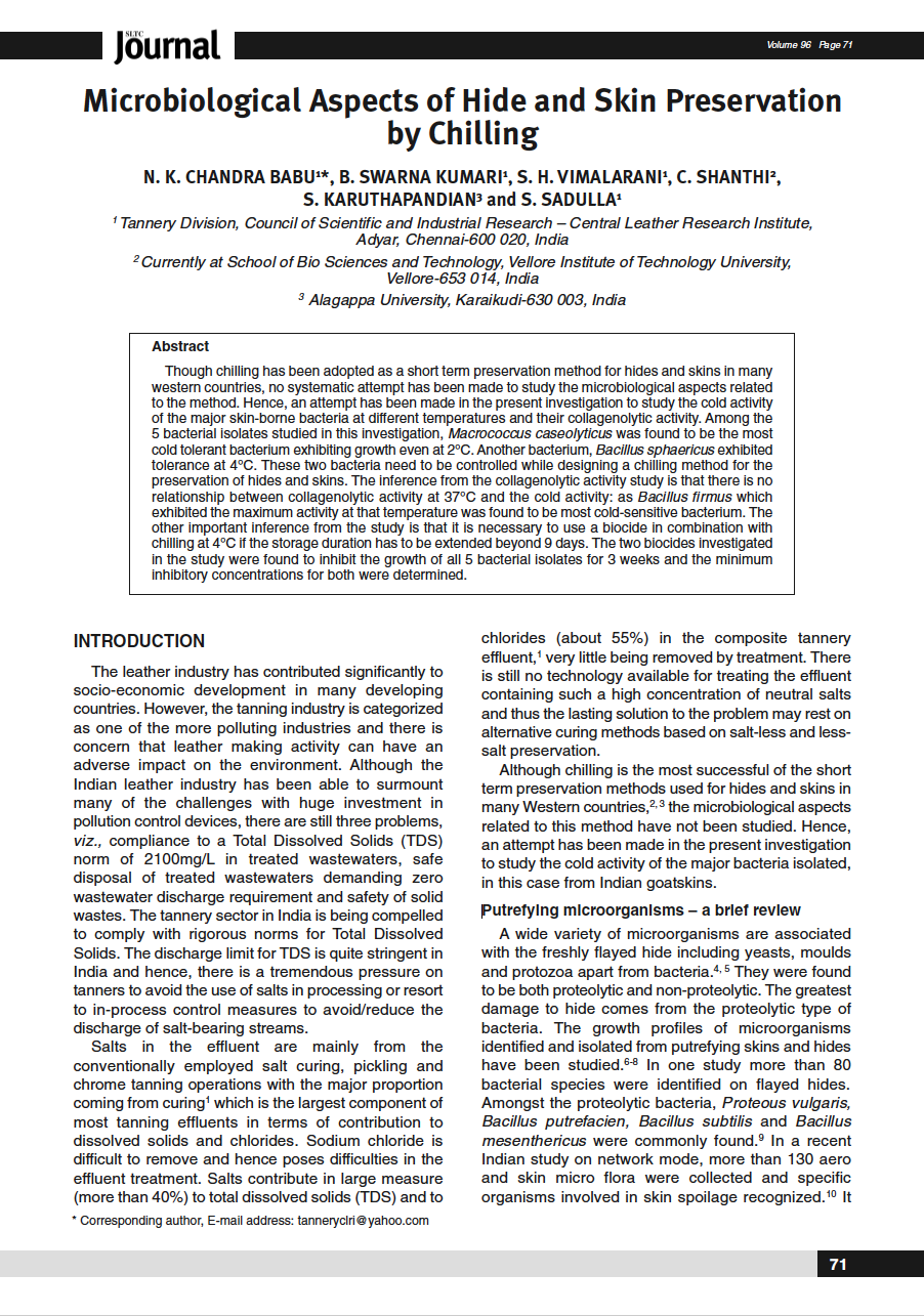 Though chilling has been adopted as a short term preservation method for hides and skins in many western countries, no systematic attempt has been made to study the microbiological aspects related to the method. Hence, an attempt has been made in the present investigation to study the cold activity of the major skin-borne bacteria at different temperatures and their collagenolytic activity. Among the 5 bacterial isolates studied in this investigation, Macrococcus caseolyticus was found to be the most cold tolerant bacterium exhibiting growth even at 2°C. Another bacterium, Bacillus sphaericus exhibited tolerance at 4°C. These two bacteria need to be controlled while designing a chilling method for the preservation of hides and skins. The inference from the collagenolytic activity study is that there is no relationship between collagenolytic activity at 37°C and the cold activity: as Bacillus firmus which exhibited the maximum activity at that temperature was found to be most cold-sensitive bacterium. The other important inference from the study is that it is necessary to use a biocide in combination with chilling at 4°C if the storage duration has to be extended beyond 9 days. The two biocides investigated in the study were found to inhibit the growth of all 5 bacterial isolates for 3 weeks and the minimum inhibitory concentrations for both were determined.