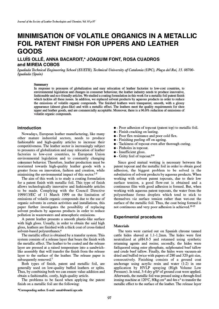 In response to pressures of globalization and easy relocation of leather factories to low-cost countries, to environmental legislation and changes in consumer behaviour, the leather industry needs to produce innovative, fashionable and eco-friendly articles. We studied a coating formulation in this work for a metallic foil patent finish which tackles all these issues. In addition, we replaced solvent products by aqueous products in order to reduce the emissions of volatile organic compounds. The finished leathers were transparent, smooth, with a glossy appearance (almost glass-like) and with a metallic effect. The leathers meet the quality requirements for shoe upper and leather goods, and are commercially acceptable. Moreover, there is a 96.8% reduction of emissions of volatile organic compounds.