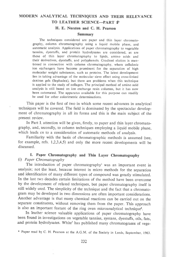 The techniques considered are paper and thin layer chromato graphy, column chromatography using a liquid mobile phase, and automatic analysis. Applications of paper chromatography to vegetable tannins, dyestuffs, and protein hydrolysates are considered, as are those of thin layer chromatography to lipids, amino acids and their derivatives, dyestuffs, and polyphenols. Gradient elution is men tioned in connection with column chromatography. where cellulosic ion exchangers have become prominent for the separation of high molecular weight substances, such as proteins. The latest development lies in taking advantage of the molecular sieve effect using cross-linked dextran gels (Sephadex), but there are problems when this technique is applied to the study of collagen. The principal method of amino acid analysis is still based on ion exchange resin columns, but it has now been automated. The apparatus available for this purpose can readily be used for other colorimetric determinations.