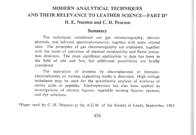 The techniques considered are gas chromatography, electro phoresis, and infrared spectrophotometry, together with some related ones. The principles of gas chromotography are explained, together with the mode of operation of thermal conductivity and flame ionisa tjon detectors. The most significant application to date has been in the field of oils and fats, but additional possibilities are briefly considered. The separation of proteins by electrophoresis or immuno electrophoresis on various supporting media is discussed. High voltage techniques may be used for the quantitative analysis of mixtures of amino acids or peptides. Electrophoresis has also been applied in investigations of chrome liquors, vegetable tanning liquors, syntans, and dye solutions.