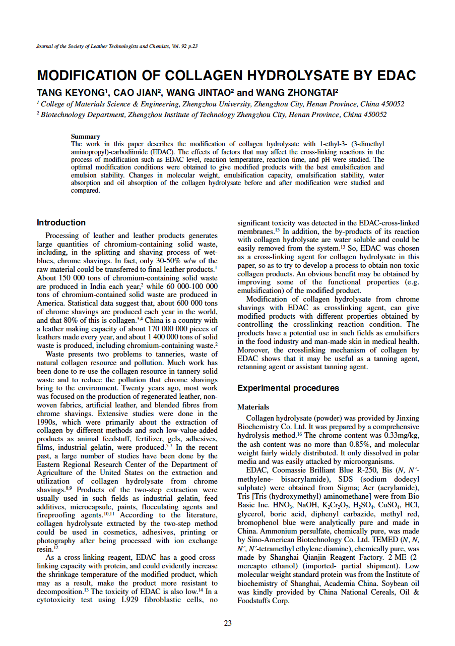 The work in this paper describes the modification of collagen hydrolysate with 1-ethyl-3- (3-dimethyl aminopropyl)-carbodiimide (EDAC). The effects of factors that may affect the cross-linking reactions in the process of modification such as EDAC level, reaction temperature, reaction time, and pH were studied. The optimal modification conditions were obtained to give modified products with the best emulsification and emulsion stability. Changes in molecular weight, emulsification capacity, emulsification stability, water absorption and oil absorption of the collagen hydrolysate before and after modification were studied and compared.