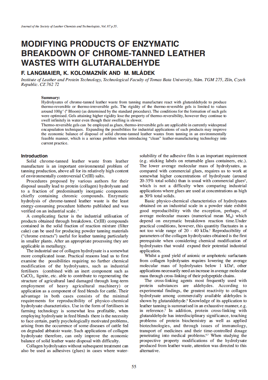 Hydrolysates of chrome-tanned leather waste from tanning manufacture react with glutaraldehyde to produce thermo-reversible or thermo-irreversible gels. The rigidity of the thermo-reversible gels is limited to values around 100g-1 (º Bloom) (as determined by the standard procedure). The conditions for the formation of such gels were optimised. Gels attaining higher rigidity lose the property of thermo-reversibility, however they continue to swell infinitely in water even though their swelling is slower. Thermo-reversible gels can be employed as glues, thermo-irreversible gels are applicable in currently widespread encapsulation techniques. Expanding the possibilities for industrial applications of such products may improve the economic balance of disposal of solid chrome-tanned leather wastes from tanning in an environmentally feasible manner, which is a serious problem when introducing “clean” leather-manufacturing technology into current practice.