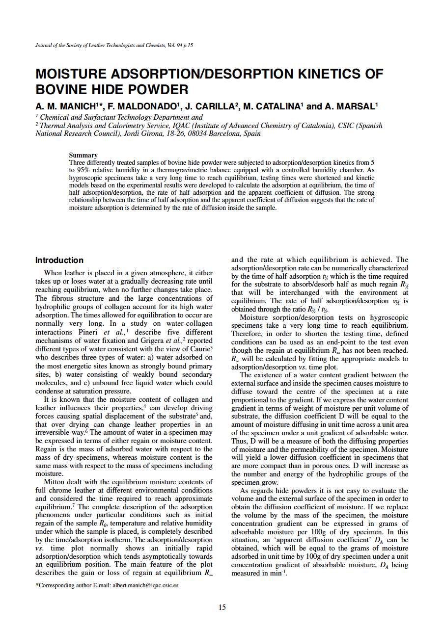 Three differently treated samples of bovine hide powder were subjected to adsorption/desorption kinetics from 5 to 95% relative humidity in a thermogravimetric balance equipped with a controlled humidity chamber. As hygroscopic specimens take a very long time to reach equilibrium, testing times were shortened and kinetic models based on the experimental results were developed to calculate the adsorption at equilibrium, the time of half adsorption/desorption, the rate of half adsorption and the apparent coefficient of diffusion. The strong relationship between the time of half adsorption and the apparent coefficient of diffusion suggests that the rate of moisture adsorption is determined by the rate of diffusion inside the sample.