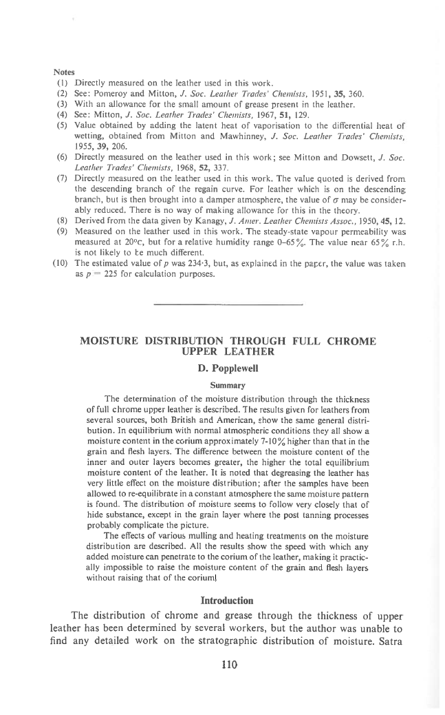 The determination of the moisture distribution through the thickness of full chrome upper leather is described. Results for leathers from several sources, both British and American, show the same general distribution. When in equilibrium with normal atmospheric conditions, all show a moisture content in the corium that is about 7-10% higher than in the grain and flesh layers. The difference in moisture content between the inner and outer layers becomes greater as the total equilibrium moisture content of the leather increases. Degreasing the leather has very little effect on moisture distribution; after samples are allowed to re-equilibrate in a constant atmosphere, the same moisture pattern is found. The moisture distribution appears to follow closely that of the hide substance, except in the grain layer, where post-tanning processes may complicate the picture. The effects of various mulling and heating treatments on moisture distribution are also described. All the results show how quickly added moisture can penetrate to the corium, making it almost impossible to increase the moisture content of the grain and flesh layers without also increasing that of the corium.