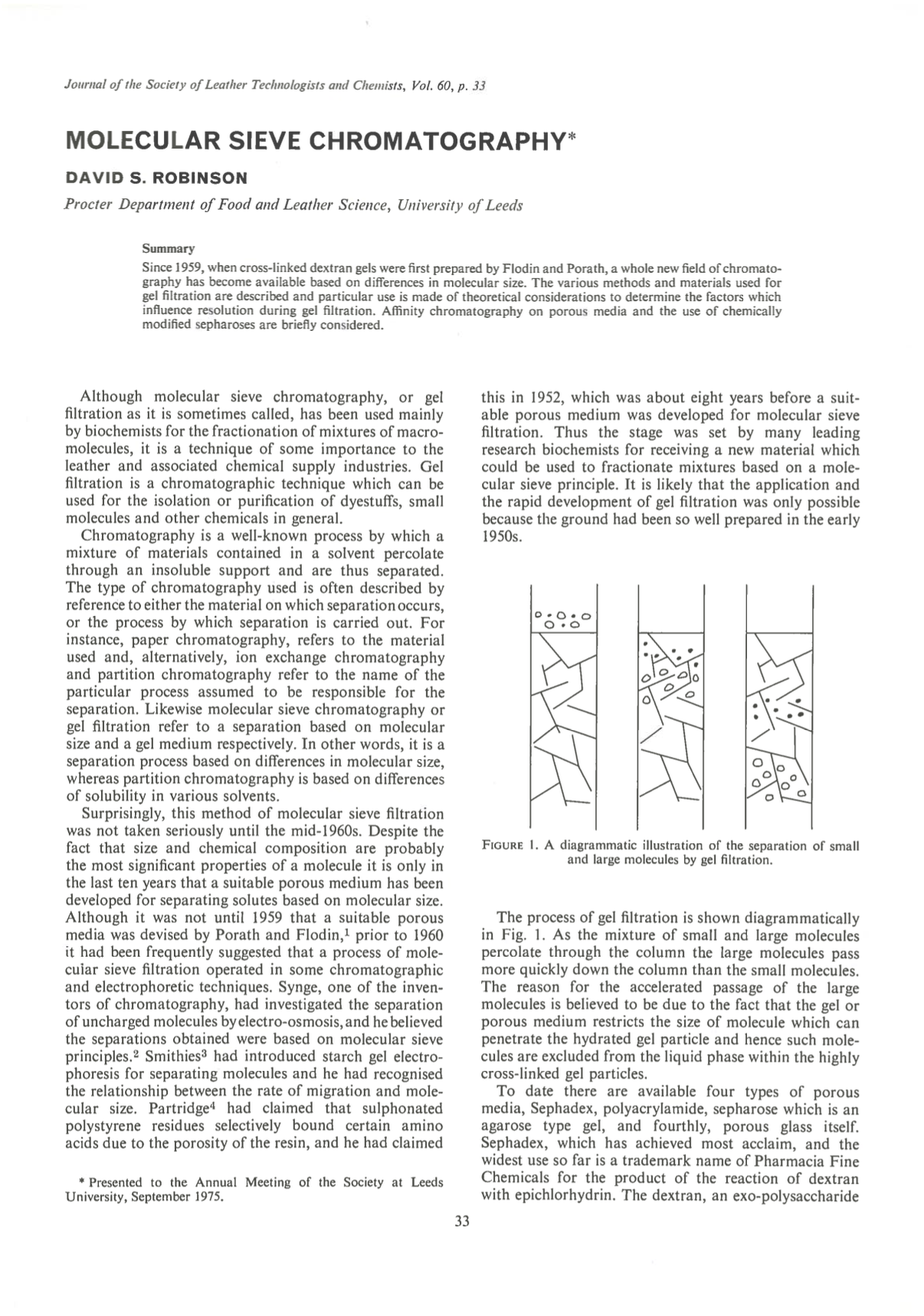 Since 1959, when cross-linked dextran gels were first prepared by Flodin and Porath, a whole new field of chromatography has become available based on differences in molecular size. The various methods and materials used for gel filtration are described and particular use is made of theoretical considerations to determine the factors which influence resolution during gel filtration. Affinity chromatography on porous media and the use of chemically modified sepharoses are briefly considered.