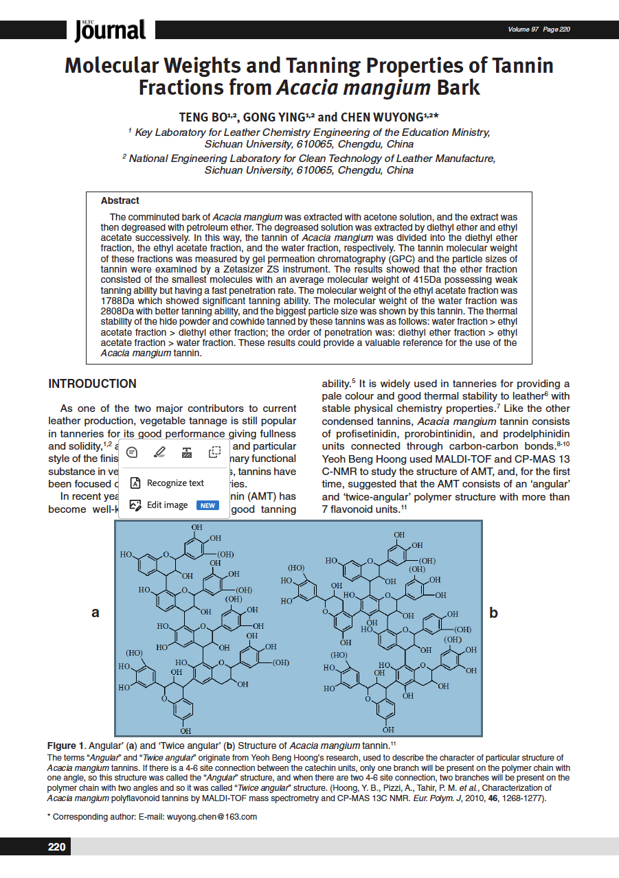 The comminuted bark of Acacia mangium was extracted with acetone solution, and the extract was then degreased with petroleum ether. The degreased solution was extracted by diethyl ether and ethyl acetate successively. In this way, the tannin of Acacia mangium was divided into the diethyl ether fraction, the ethyl acetate fraction, and the water fraction, respectively. The tannin molecular weight of these fractions was measured by gel permeation chromatography (GPC) and the particle sizes of tannin were examined by a Zetasizer ZS instrument. The results showed that the ether fraction consisted of the smallest molecules with an average molecular weight of 415Da possessing weak tanning ability but having a fast penetration rate. The molecular weight of the ethyl acetate fraction was 1788Da which showed significant tanning ability. The molecular weight of the water fraction was 2808Da with better tanning ability, and the biggest particle size was shown by this tannin. The thermal stability of the hide powder and cowhide tanned by these tannins was as follows: water fraction > ethyl acetate fraction > diethyl ether fraction; the order of penetration was: diethyl ether fraction > ethyl acetate fraction > water fraction. These results could provide a valuable reference for the use of the Acacia mangium tannin.