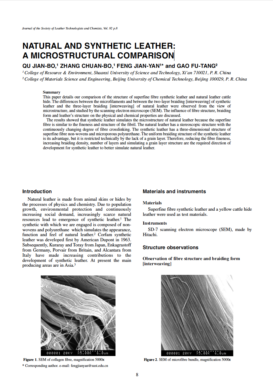 The results showed that synthetic leather simulates the microstructure of natural leather because the superfine fibre is similar to the fineness and structure of the fibril. The natural leather has a stereoscopic structure with the continuously changing degree of fibre crosslinking. The synthetic leather has a three-dimensional structure of superfine fibre non-wovens and microporous polyurethane. The uniform braiding structure of the synthetic leather is its advantage, but it is restricted technically by the lack of a grain layer. Therefore, reducing the fibre fineness, increasing braiding density, number of layers and simulating a grain layer structure are the required direction of development for synthetic leather to better simulate natural leather.