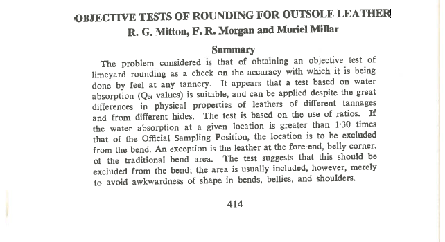 The problem considered is that of obtaining an objective test of limeyard rounding as a check on the accuracy with which it is being done by feel at any tannery. It appears that a test based on water absorption (Q4 values) is suitable, and can be applied despite the great differences in physical properties of leathers of different tannages and from different hides. The test is based on the use of ratios. If the water absorption at a given location is greater than 130 times that of the Official Sampling Position, the location is to be excluded from the bend. An exception is the leather at the fore-end, belly corner, of the traditional bend area. The test suggests that this should be excluded from the bend; the area is usually included, however, merely to avoid awkwardness of shape in bends, bellies, and shoulders.