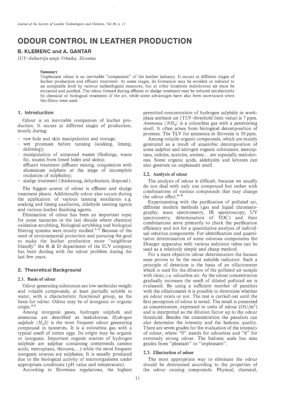 Unpleasant odour is an inevitable “companion” of the leather industry. It occurs at different stages of leather production and effluent treatment. At some stages, its formation may be avoided or reduced to an acceptable level by various technological measures, but at other locations malodorous air must be extracted and purified. The odour formed during effluent or sludge treatment may be reduced satisfactorily by chemical or biological treatment of the air, while some advantages have also been ascertained when bio-filters were used.