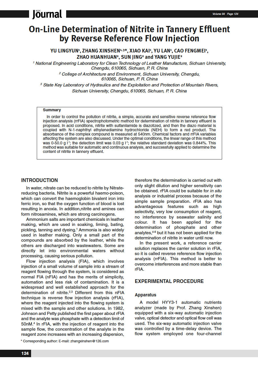 In order to control the pollution of nitrite, a simple, accurate and sensitive reverse reference flow injection analysis (rrFIA) spectrophotometric method for determination of nitrite in tannery effluent is proposed. In acid conditions, nitrite with sulfanilamide is diazotized, and then the diazo material is coupled with N-1-naphthyl ethylenediamine hydrochloride (NEH) to form a red product. The absorbance of the complex compound is measured at 540nm. Chemical factors and rrFIA variables affecting the system are also discussed. Under the optimal conditions, the linear range of this method was 0-50.0 g l-1; the detection limit was 0.03 g l-1; the relative standard deviation was 0.844%. This method was suitable for automatic and continuous analysis, and successfully applied to determine the content of nitrite in tannery effluent.