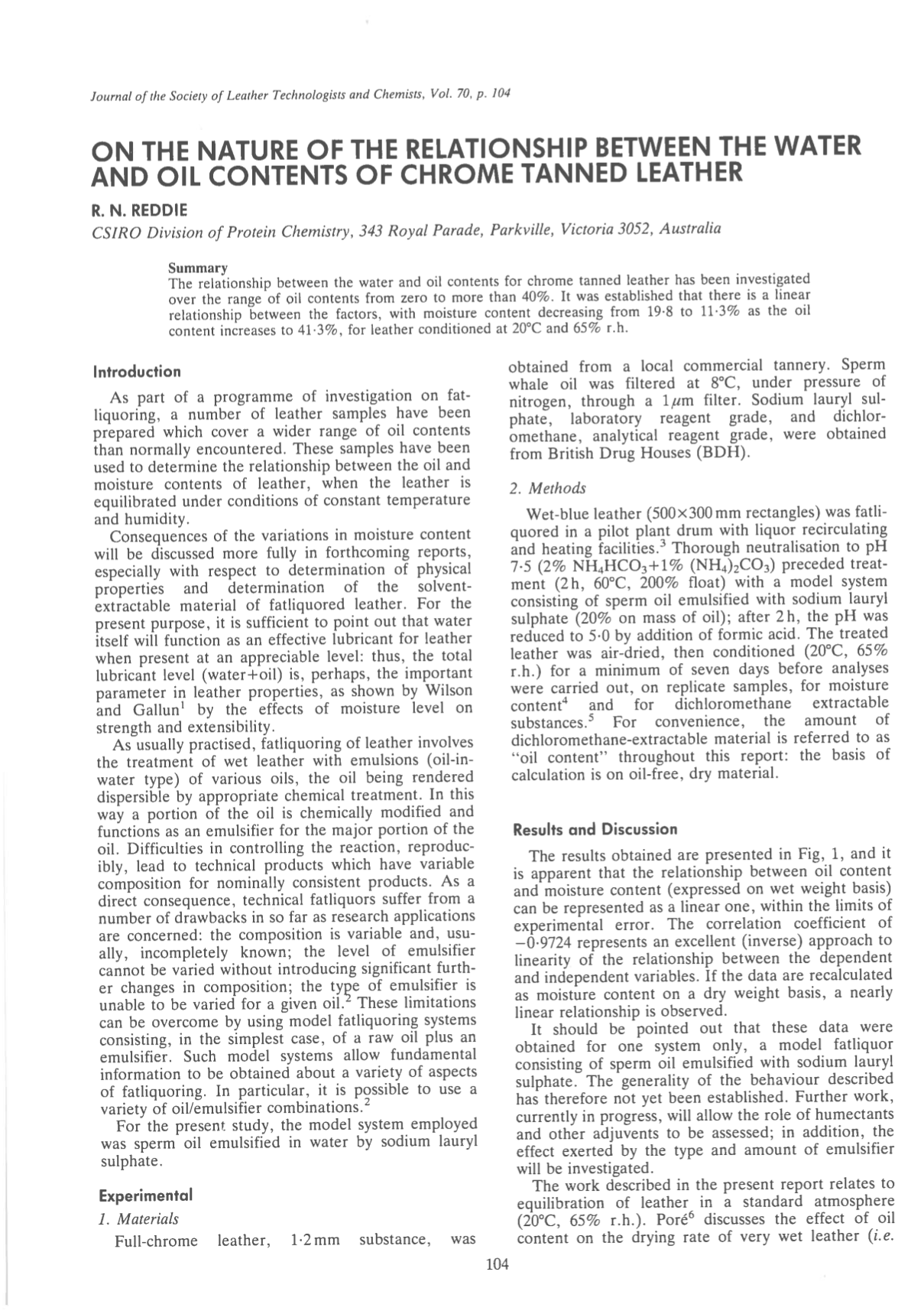 The relationship between the water and oil contents for chrome tanned leather has been investigated over the range of oil contents from zero to more than 40%. It was established that there is a linear relationship between the factors, with moisture content decreasing from 19.8 to 11.3% as the oil content increases to 41.3%, for leather conditioned at 20°C and 65% r.h.