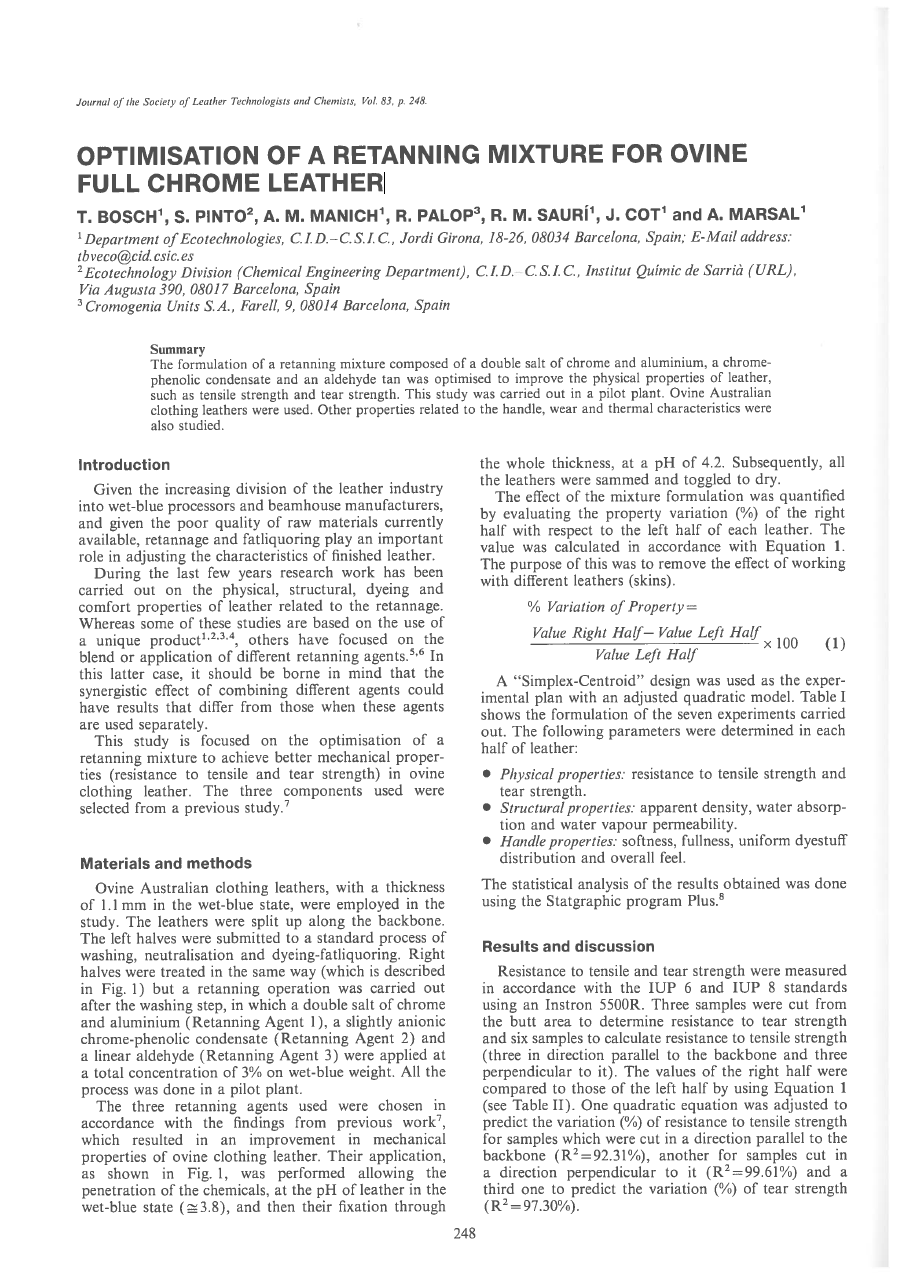 The formulation of a retanning mixture composed of a double salt of chrome and aluminium, a chrome phenolic condensate and an aldehyde tan was optimised to improve the physical properties of leather, such as tensile strength and tear strength. This study was carried out in a pilot plant. Ovine Australian clothing leathers were used. Other properties related to the handle, wear and thermal characteristics were also studied.