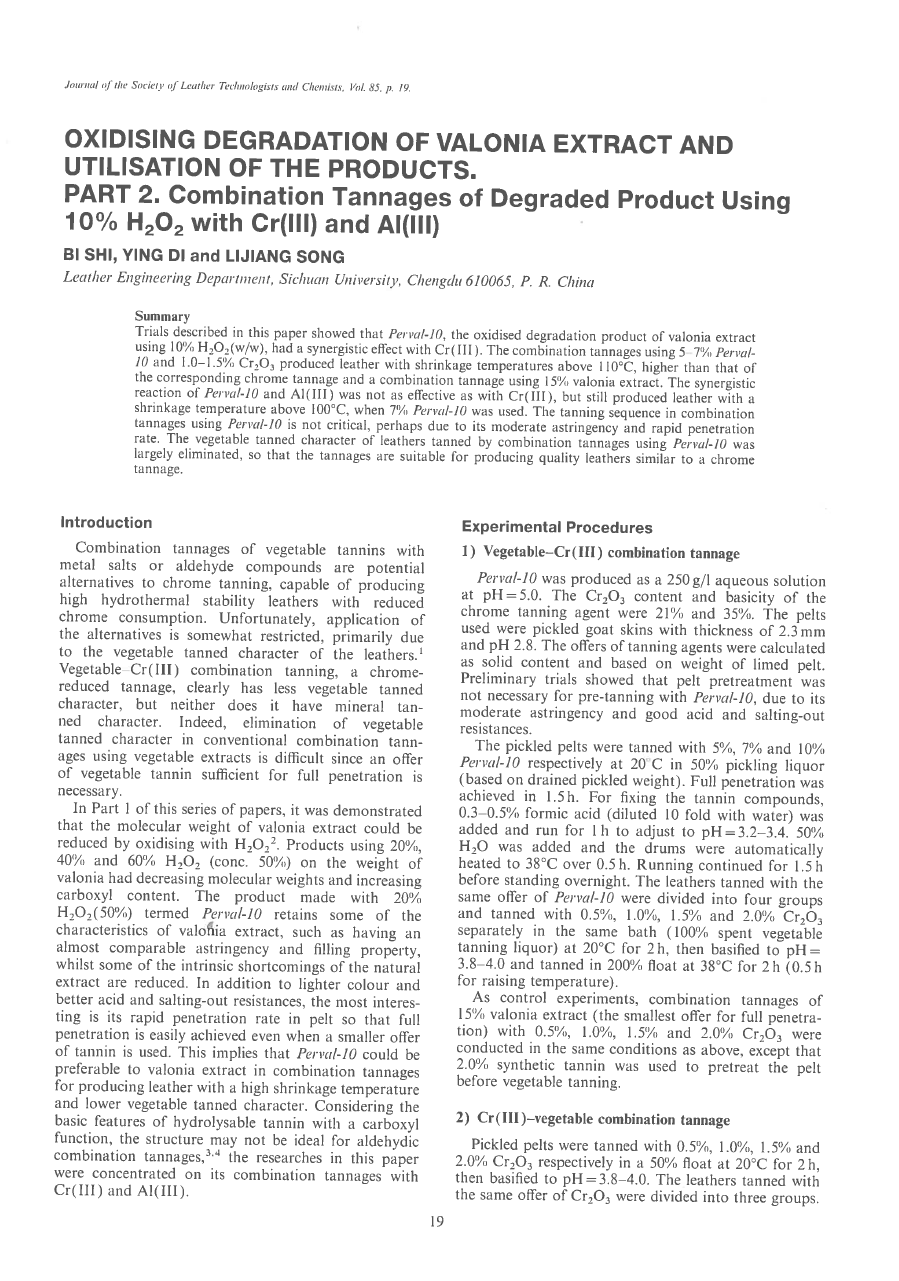 Trials described in this paper showed that Perval-JO, the oxidised degradation product of valonia extract using 10% H,O,(w/w), had a synergistic effect with Cr(III). The combination tannages using 5—7% Perval JO and 1.0—I .5 Cr,03produced leather with shrinkage temperatures above 110 C. higher than that of the corresponding chrome tannage and a combination tannage using 15% valonia extract. The synergistic reaction of Perval-JO and Al(III) was not as effective as with Cr(III), but still produced leather with a shrinkage temperature above 100°C, when 7% Pen’al-JO was used. The tanning sequence in combination tannages using Penal-JO is not critical, perhaps due to its moderate astringency and rapid penetration rate. The vegetable tanned character of leathers tanned by combination tannages using Penal-JO was largely eliminated, so that the tannages are suitable for producing quality leathers similar to a chrome tannage.