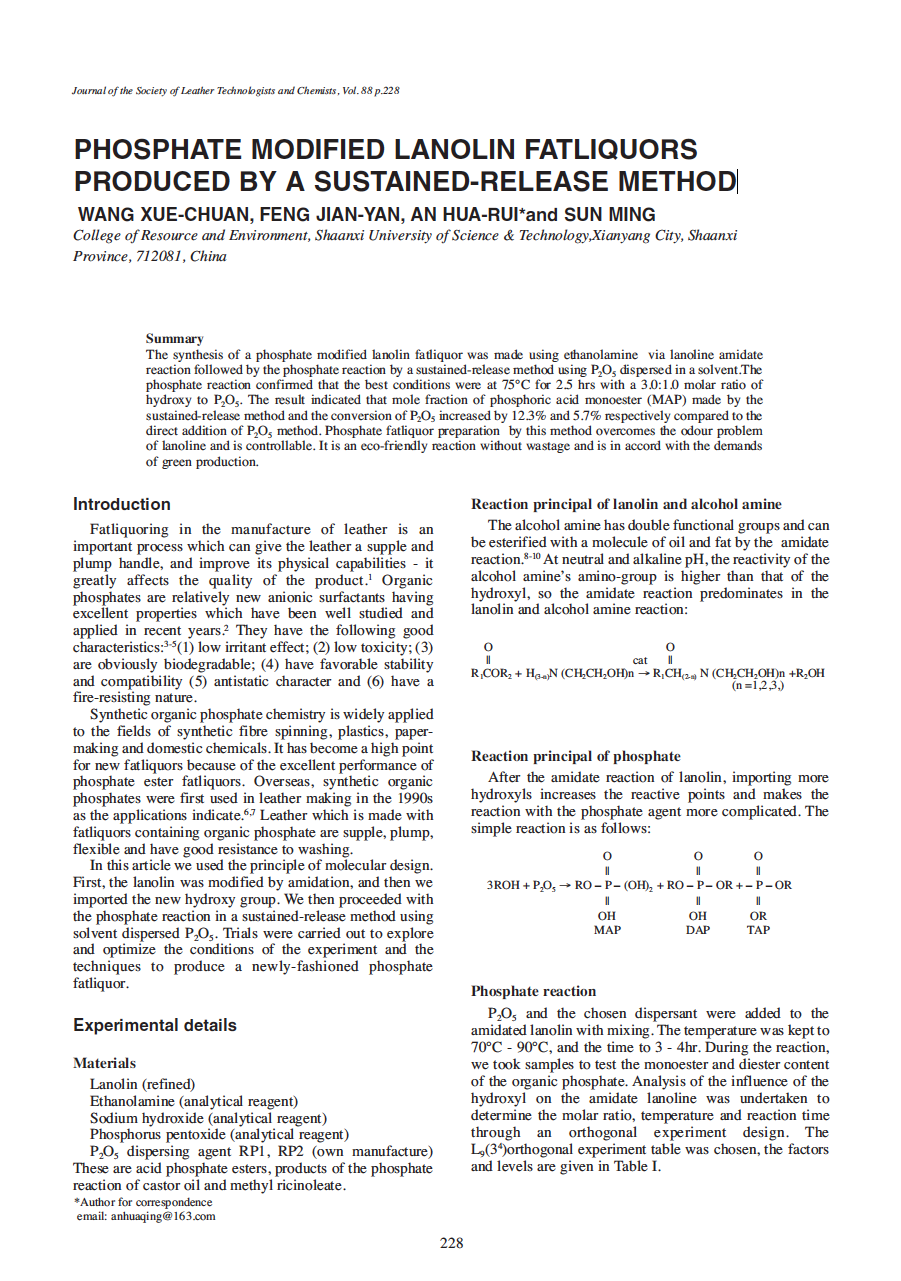 The synthesis of a phosphate modified lanolin fatliquor was made using ethanolamine via lanoline amidate reaction followed by the phosphate reaction by a sustained-release method using P2O5 dispersed in a solvent.The phosphate reaction confirmed that the best conditions were at 75°C for 2.5 hrs with a 3.0:1.0 molar ratio of hydroxy to P2O5. The result indicated that mole fraction of phosphoric acid monoester (MAP) made by the sustained-release method and the conversion of P2O5 increased by 12.3% and 5.7% respectively compared to the direct addition of P2O5 method. Phosphate fatliquor preparation by this method overcomes the odour problem of lanoline and is controllable. It is an eco-friendly reaction without wastage and is in accord with the demands of green production.
