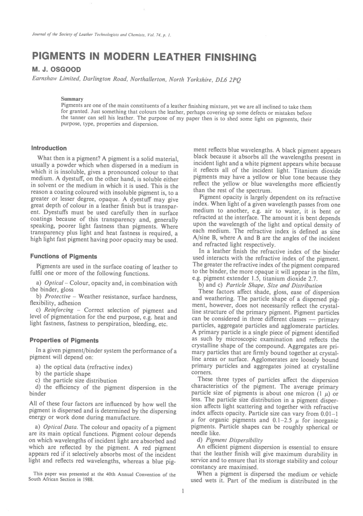 Pigments are one of the main constituents of a leather finishing mixture, yet we are all inclined to take them for granted. Just something that colours the leather, perhaps covering up some defects or mistakes before the tanner can sell his leather. The purpose of my paper then is to shed some light on pigments, their purpose, type, properties and dispersion.