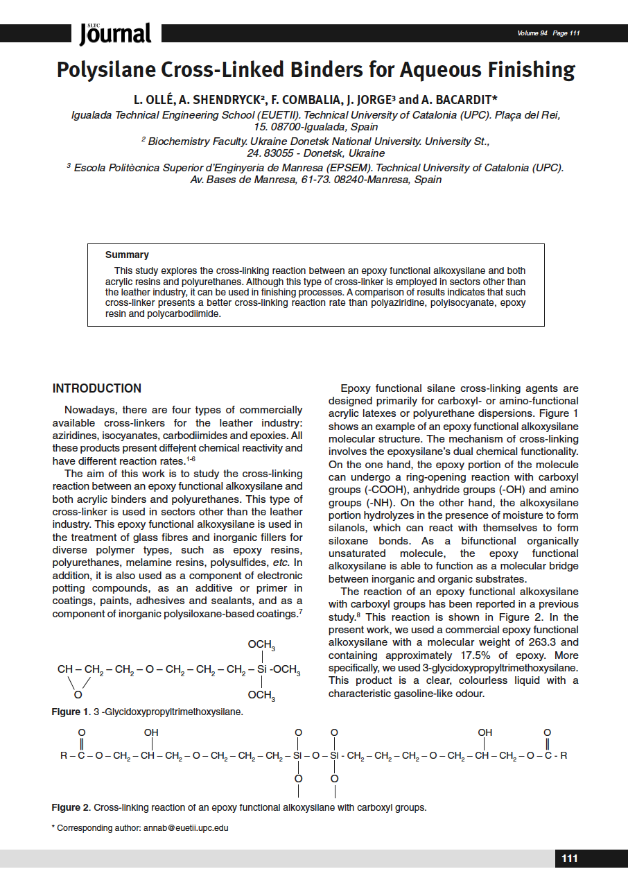 This study explores the cross-linking reaction between an epoxy functional alkoxysilane and both acrylic resins and polyurethanes. Although this type of cross-linker is employed in sectors other than the leather industry, it can be used in finishing processes. A comparison of results indicates that such cross-linker presents a better cross-linking reaction rate than polyaziridine, polyisocyanate, epoxy resin and polycarbodiimide.