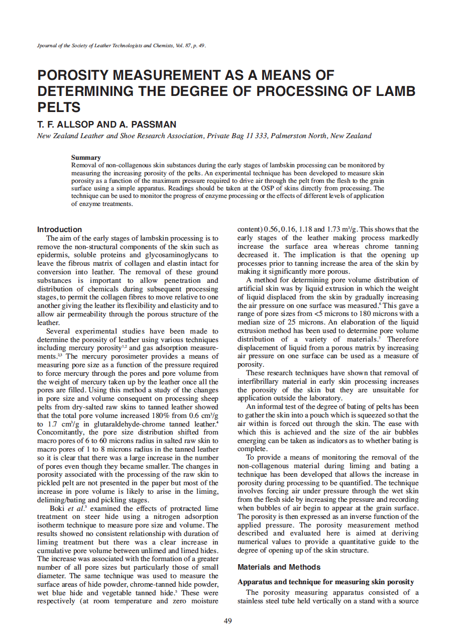 Removal of non-collagenous skin substances during the early stages of lambskin processing can be monitored by measuring the increasing porosity of the pelts. An experimental technique has been developed to measure skin porosity as a function of the maximum pressure required to drive air through the pelt from the flesh to the grain surface using a simple apparatus. Readings should be taken at the OSP of skins directly from processing. The technique can be used to monitor the progress of enzyme processing or the effects of different levels of application of enzyme treatments.