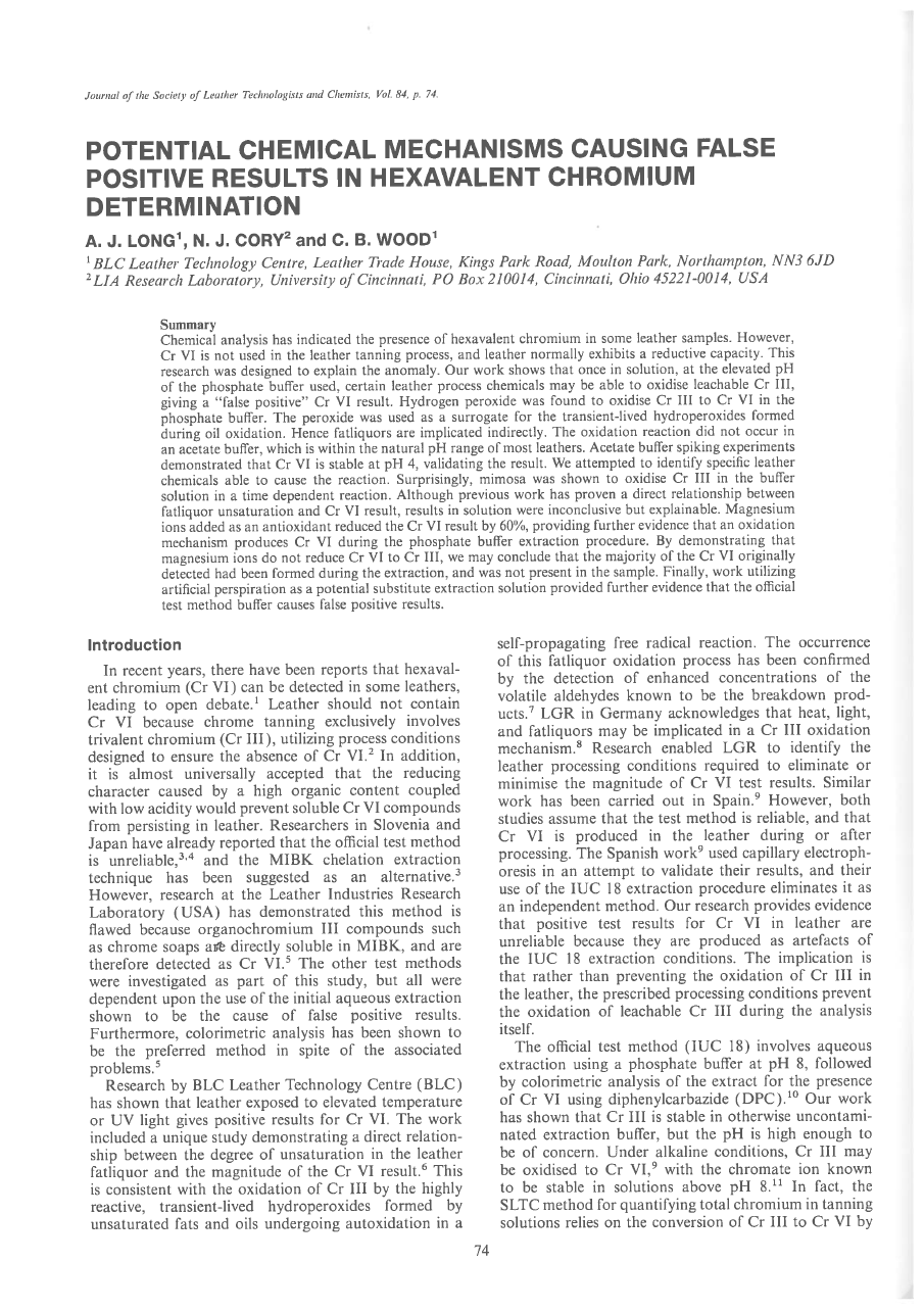 Chemical analysis has indicated the presence of hexavalent chromium in some leather samples. However, Cr VI is not used in the leather tanning process, and leather normally exhibits a reductive capacity. This research was designed to explain the anomaly. Our work shows that once in solution, at the elevated pH of the phosphate buffer used, certain leather process chemicals may be able to oxidise leachable Cr III, giving a “false positive” Cr VI result. Hydrogen peroxide was found to oxidise Cr III to Cr VI in the phosphate buffer. The peroxide was used as a surrogate for the transient-lived hydroperoxides formed during oil oxidation. Hence fatliquors are implicated indirectly. The oxidation reaction did not occur in an acetate buffer, which is within the natural pH range of most leathers. Acetate buffer spiking experiments demonstrated that Cr VI is stable at pH 4, validating the result. We attempted to identify specific leather chemicals able to cause the reaction. Surprisingly, mimosa was shown to oxidise Cr III in the buffer solution in a time dependent reaction. Although previous work has proven a direct relationship between fatliquor unsaturation and Cr VI result, results in solution were inconclusive but explainable. Magnesium ions added as an antioxidant reduced the Cr VI result by 60%, providing further evidence that an oxidation mechanism produces Cr VI during the phosphate buffer extraction procedure. By demonstrating that magnesium ions do not reduce Cr VI to Cr III, we may conclude that the majority of the Cr VI originally detected had been formed during the extraction, and was not present in the sample. Finally, work utilizing artificial perspiration as a potential substitute extraction solution provided further evidence that the official test method buffer causes false positive results.