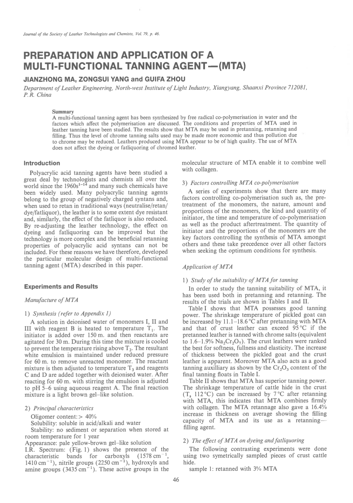 A multi-functional tanning agent has been synthesized by free radical co-polymerisation in water and the factors which affect the polymerisation are discussed. The conditions and properties of MTA used in leather tanning have been studied. The results show that MTA may be used in pretanning, retanning and filling. Thus the level of chrome tanning salts used may be made more economic and thus pollution due to chrome may be reduced. Leathers produced using MTA appear to be of high quality. The use of MTA does not affect the dyeing or fatliquoring of chromed leather.