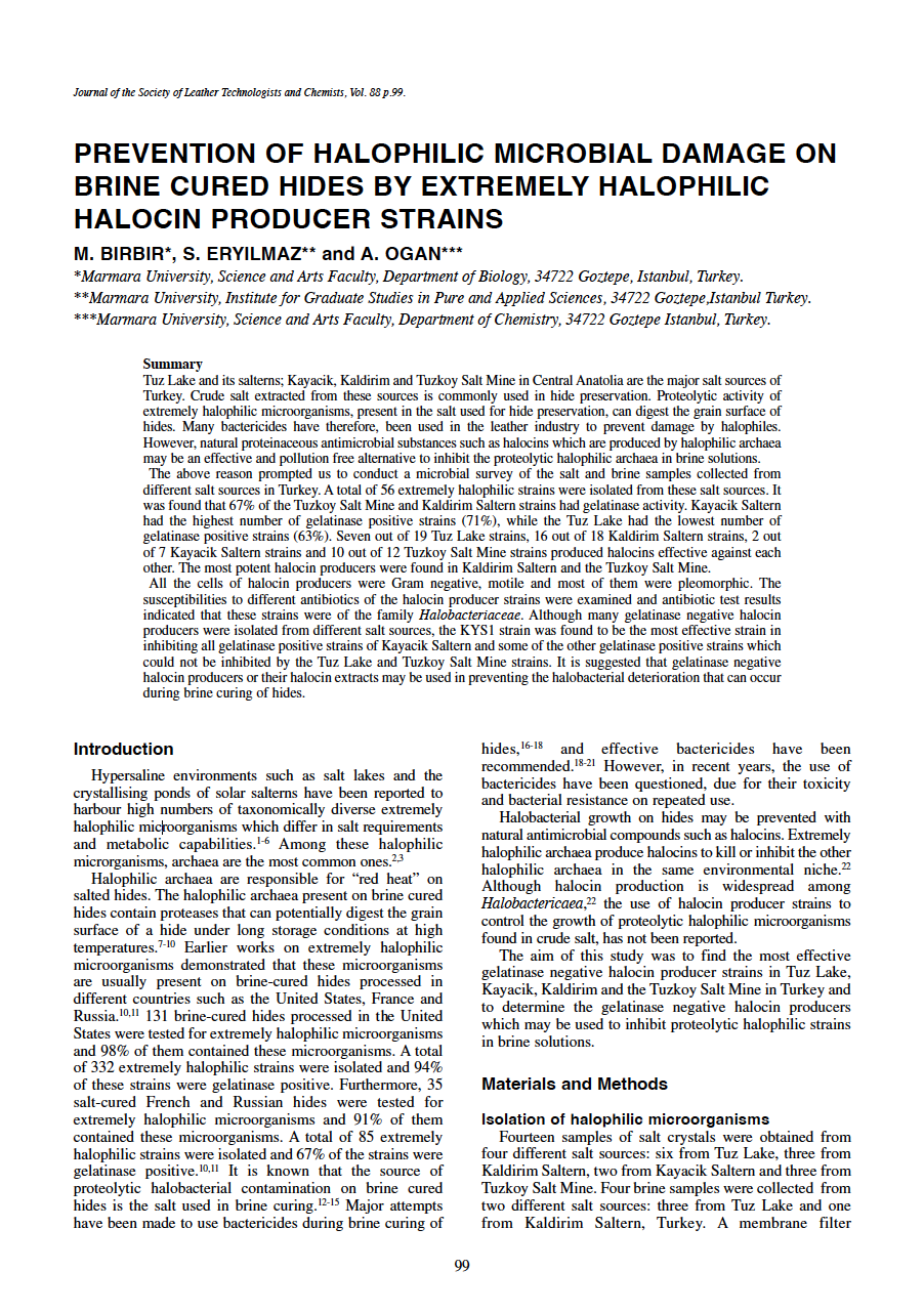 Tuz Lake and its salterns; Kayacik, Kaldirim and Tuzkoy Salt Mine in Central Anatolia are the major salt sources of Turkey. Crude salt extracted from these sources is commonly used in hide preservation. Proteolytic activity of extremely halophilic microorganisms, present in the salt used for hide preservation, can digest the grain surface of hides. Many bactericides have therefore, been used in the leather industry to prevent damage by halophiles. However, natural proteinaceous antimicrobial substances such as halocins which are produced by halophilic archaea may be an effective and pollution free alternative to inhibit the proteolytic halophilic archaea in brine solutions.