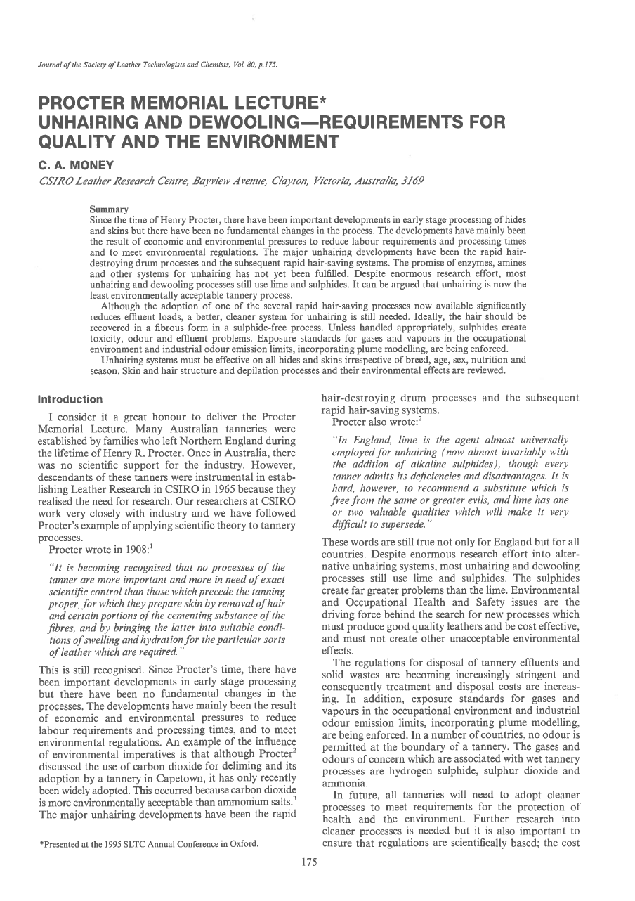 Since the time of Henry Procter, there have been important developments in early stage processing of hides and skins but there have been no fundamental changes in the process. The developments have mainly been the result of economic and environmental pressures to reduce labour requirements and processing times and to meet environmental regulations. The major unhairing developments have been the rapid hairdestroying drum processes and the subsequent rapid hair-saving systems. The promise of enzymes, amines and other systems for unhairing has not yet been fulfilled. Despite enormous research effort, most unhairing and dewooling processes still use lime and suiphides. It can be argued that unhairing is now the least environmentally acceptable tannery process. Although the adoption of one of the several rapid hair-saving processes now available significantly reduces effluent loads, a better, cleaner system for unhairing is still needed. Ideally, the hair should be recovered in a fibrous form in a sulphide-free process. Unless handled appropriately, sulphides create toxicity, odour and effluent problems. Exposure standards for gases and vapours in the occupational environment and industrial odour emission limits, incorporating plume modelling, are being enforced. Unhairing systems must be effective on all hides and skins irrespective of breed, age, sex, nutrition and season. Skin and hair structure and depilation processes and their environmental effects are reviewed.
