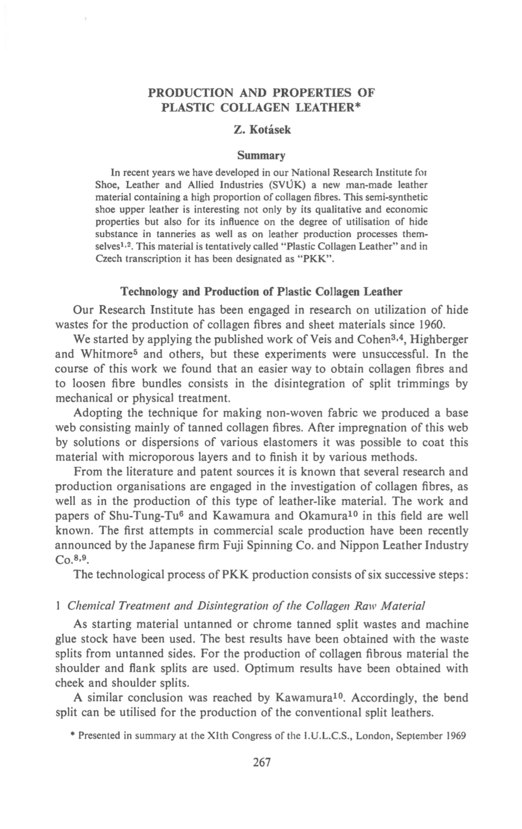 In recent years we have developed in our National Research Institute for Shoe, Leather and Allied Industries (SVUK) a new man-made leather material containing a high proportion of collagen fibres. This semi-synthetic shoe upper leather is interesting not only by its qualitative and economic properties but also for its influence on the degree of utilisation of hide substance in tanneries as well as on leather production processes themselves. This material is tentatively called “Plastic Collagen Leather” and in Czech transcription it has been designated as “PKK”.